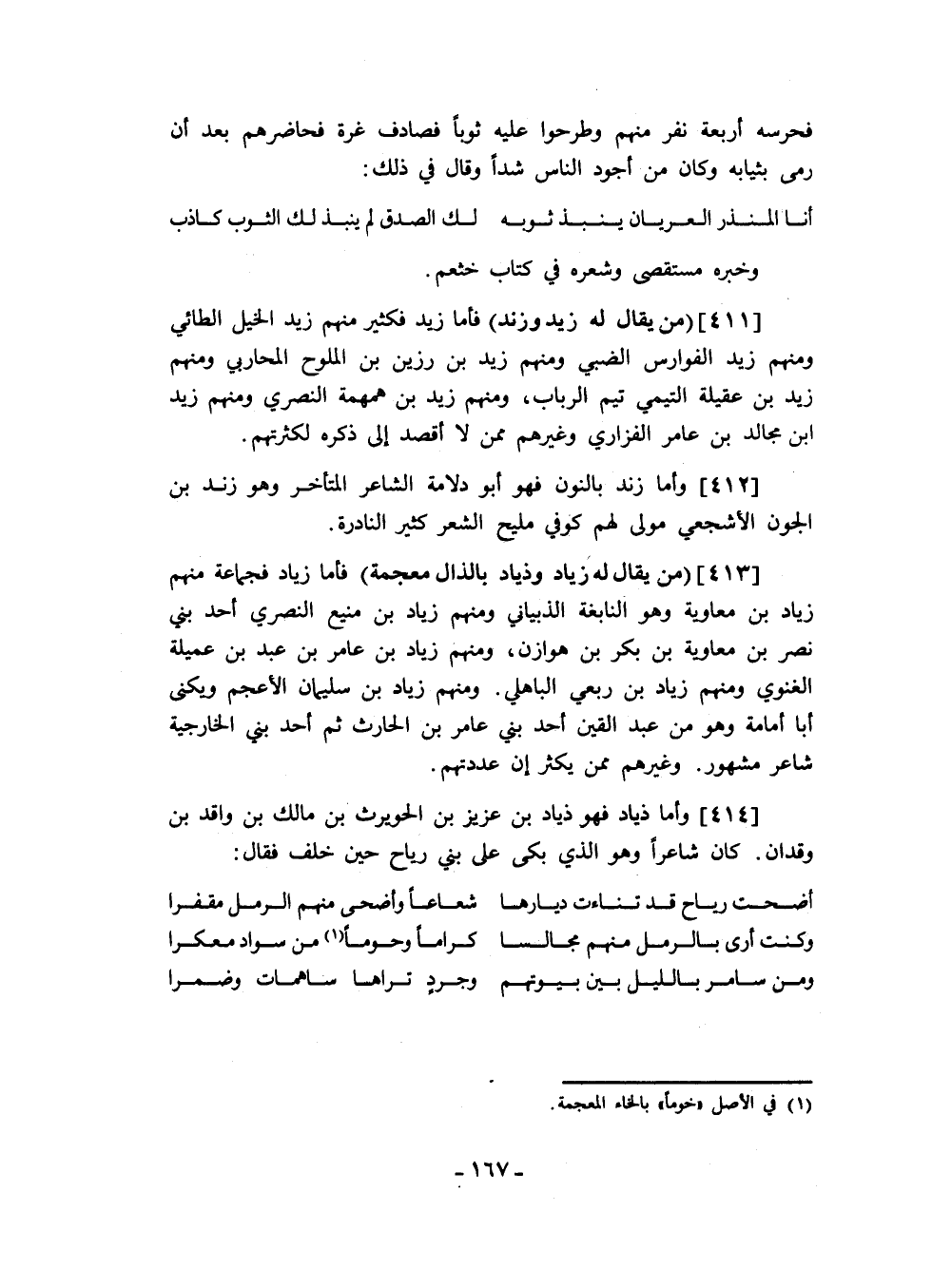 من يقال له زيد وزند فأما زيد فكثير منهم زيد الخيل الطائي ومنهم زيد الفوارس الضبي ومنهم زيد بن رزين بن الملوح المحاربي ومنهم زيد بن عقيلة التيمي تيم الرباب، ومنهم زيد بن همهمة النصري ومنهم زيد ابن مجالد بن عامر الفزاري وغيرهم ممن لا أقصد إلى ذكره لكثرتهم.