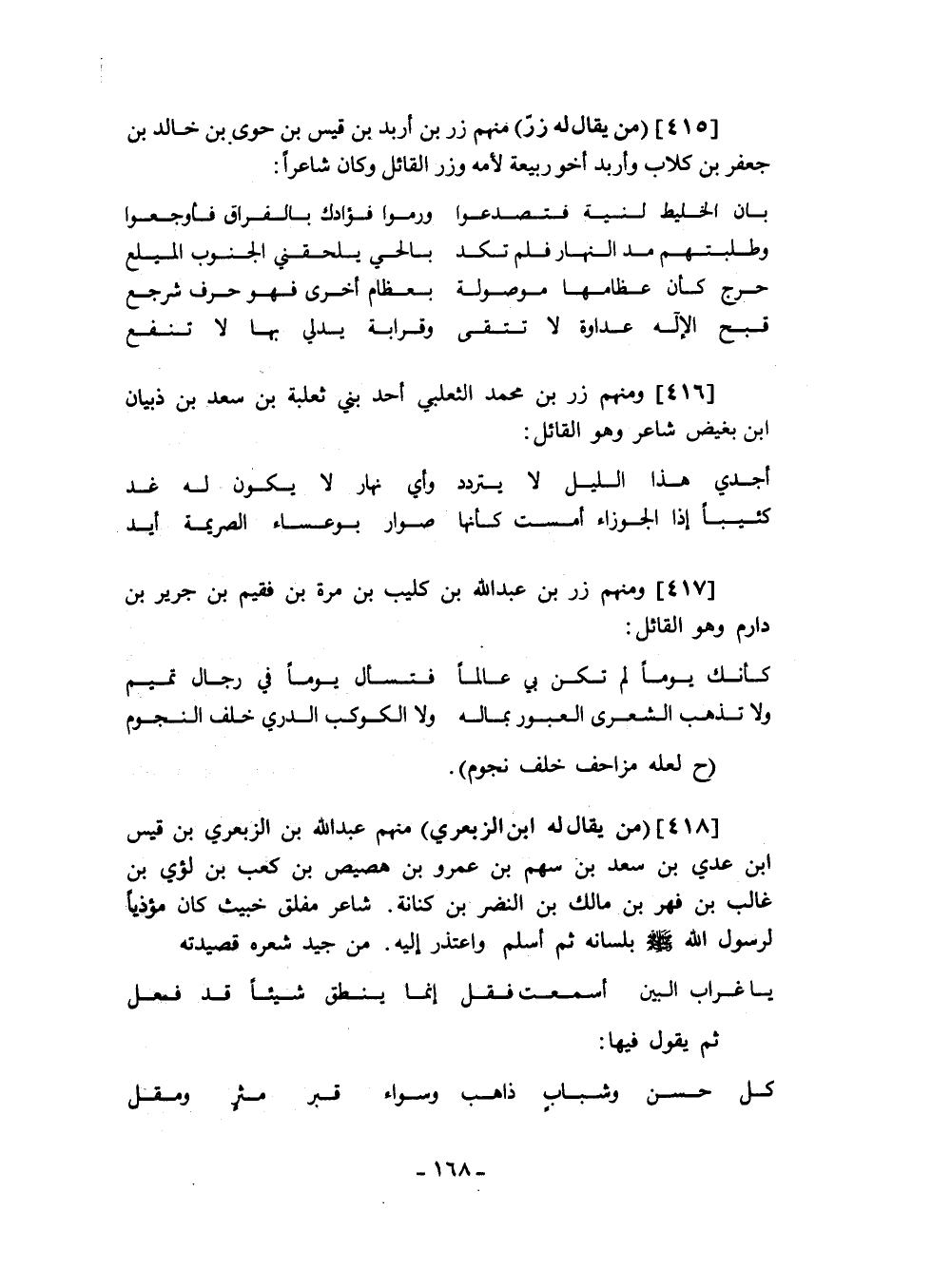 ومنهم زر بن محمد الثعلبي أحد بني ثعلبة بن سعد بن ذبيان ابن بغيض شاعر وهو القائل: