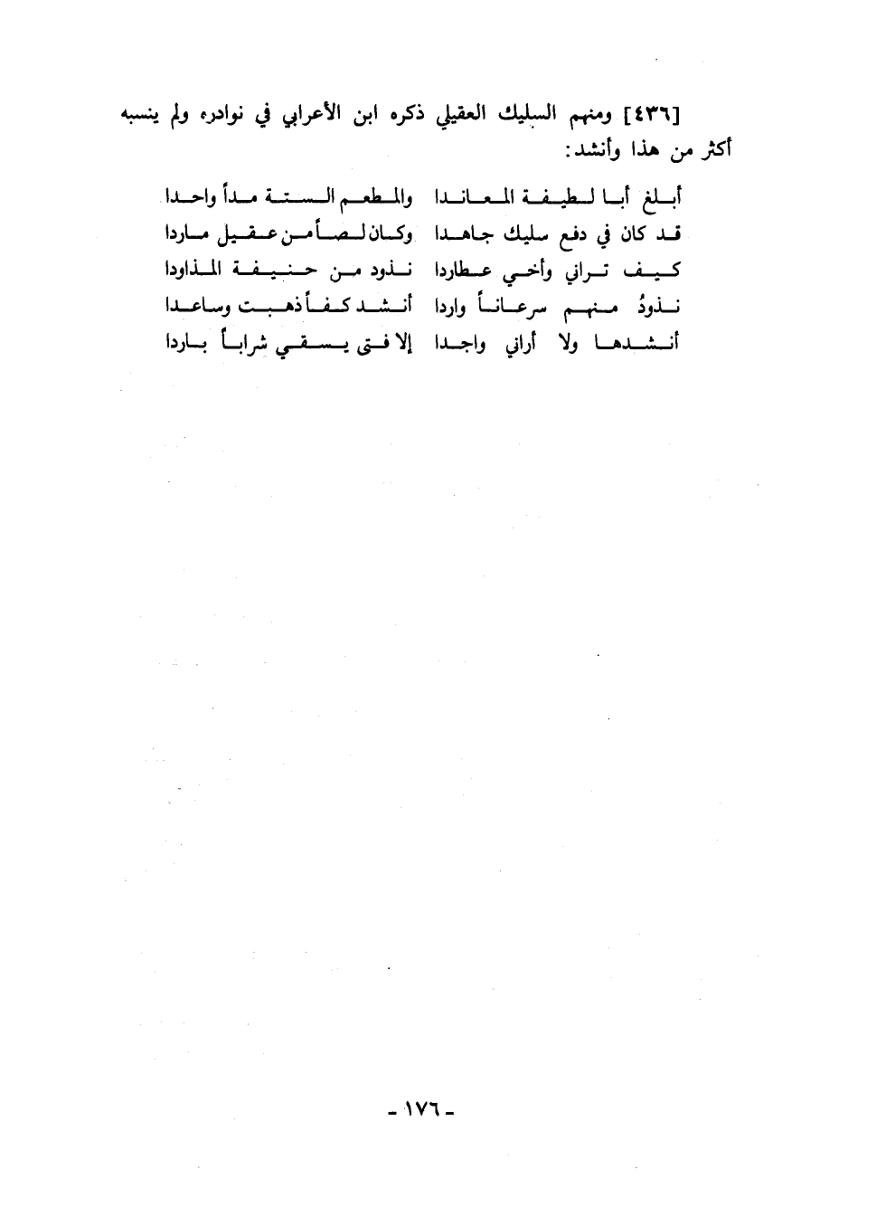 ومنهم السليك العقيلي ذكره ابن الأعرابي في نوادره ولم ينسبه أكثر من هذا وأنشد: