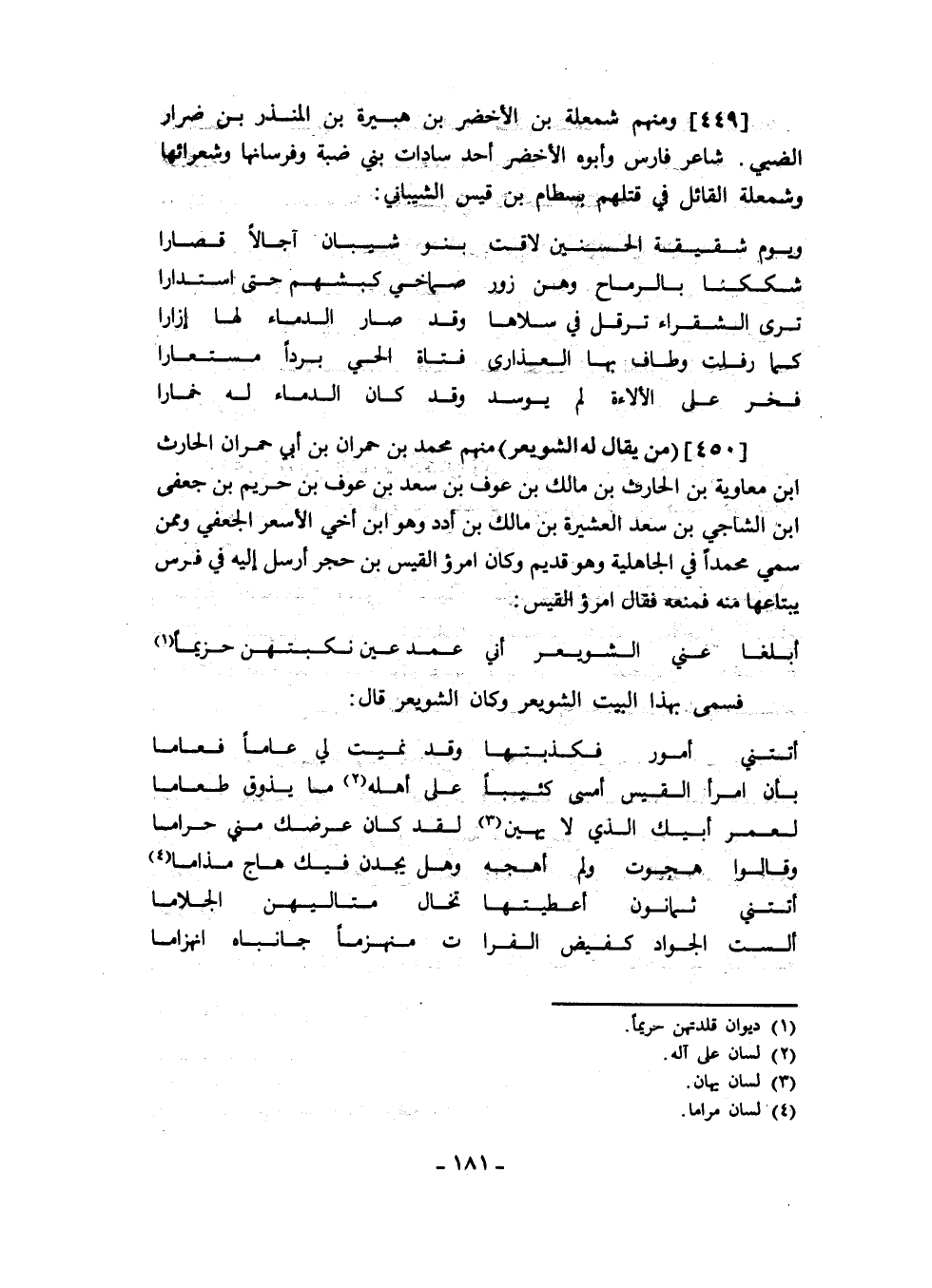 من يقال له الشويعر منهم محمد بن حمران بن أبي حمران الحارث ابن معاوية بن الحارث بن مالك بن عوف بن سعد بن عوف بن حريم بن جعفى ابن الشاجي بن سعد العشيرة بن مالك بن أدد وهو ابن أخي الأسعر الجعفي وممن سمي محمداً في الجاهلية وهو قديم وكان امرؤ القيس بن حجر أرسل إليه في فرس يبتاعها منه فمنعه فقال امرؤ القيس: