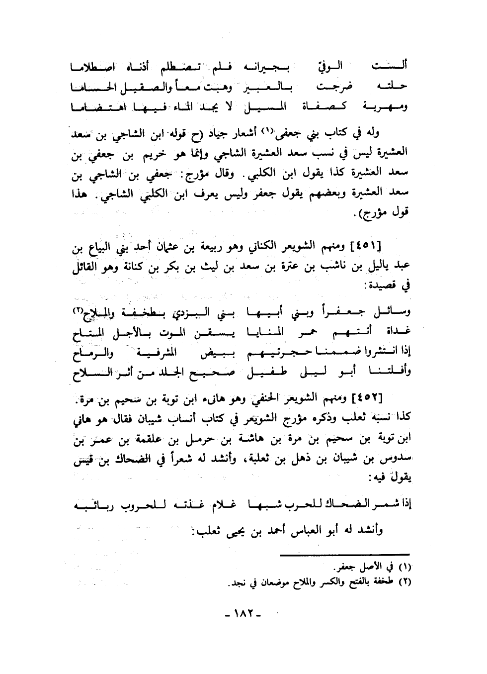 وله في كتاب بني جعفى أشعار جياد قوله ابن الشاجي بن سعد العشيرة ليس في نسب سعد العشيرة الشاجي وإنما هو خريم بن جعفي بن سعد العشيرة كذا يقول ابن الكلبي. وقال مؤرج: جعفي بن الشاجي بن سعد العشيرة وبعضهم يقول جعفر وليس يعرف ابن الكلبي الشاجي. هذا قول مؤرج.