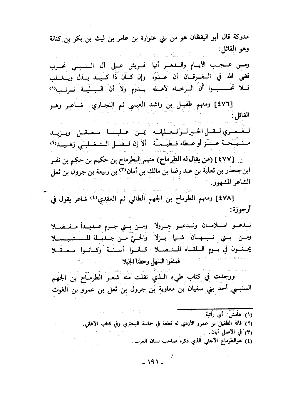 ووجدت في كتاب طيء الذي نقلت منه شعر الطرماح بن الجهم السنبسي أحد بني سفيان بن معاوية بن جرول بن ثعل بن عمرو بن الغوث