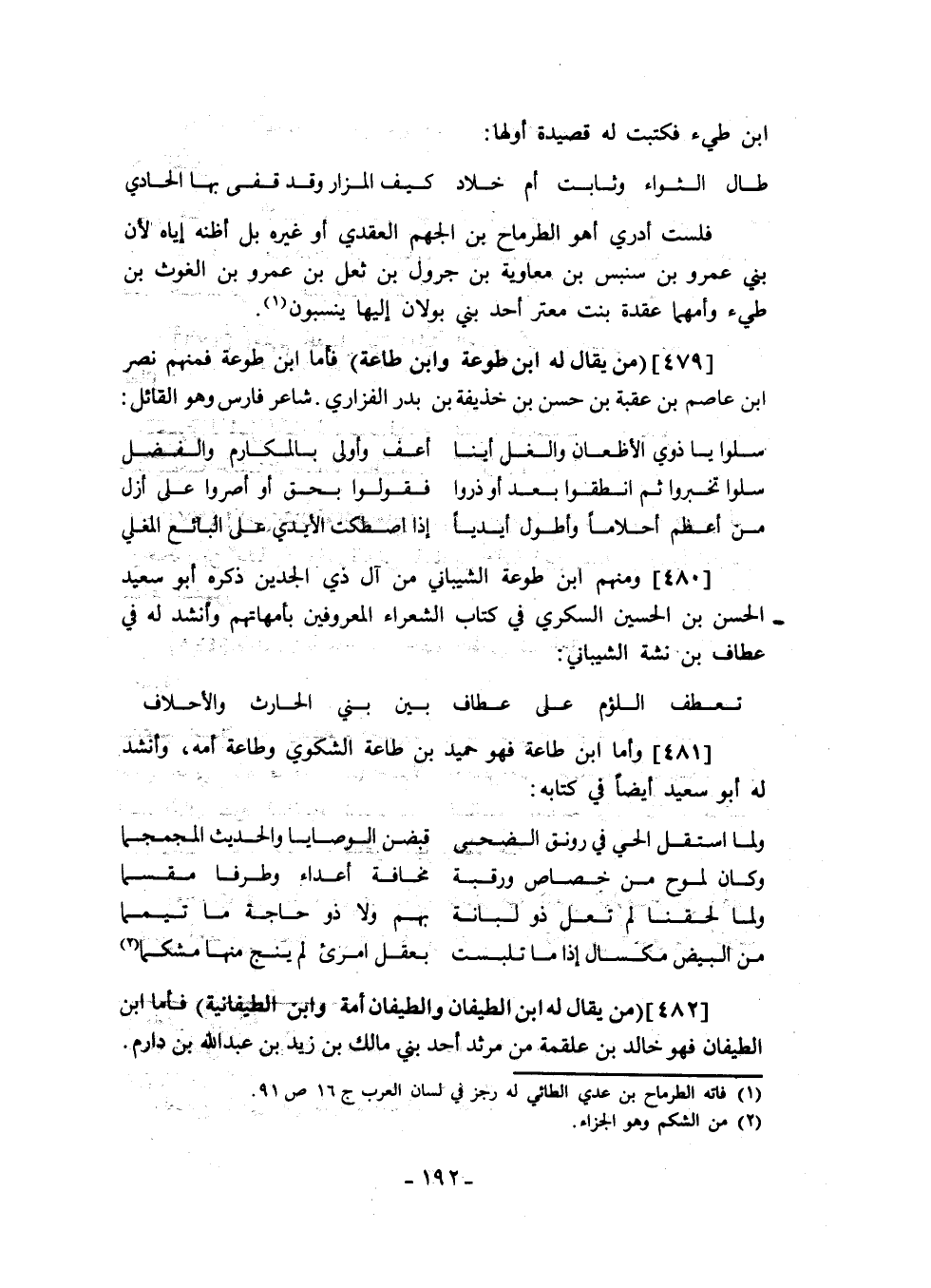 فلست أدري أهو الطرماح بن الجهم العقدي أو غيره بل أظنه إياه لأن بني عمرو بن سنبس بن معاوية بن جرول بن ثعل بن عمرو بن الغوث بن طيء وأمهما عقدة بنت معتر أحد بني بولان إليها ينسبون.