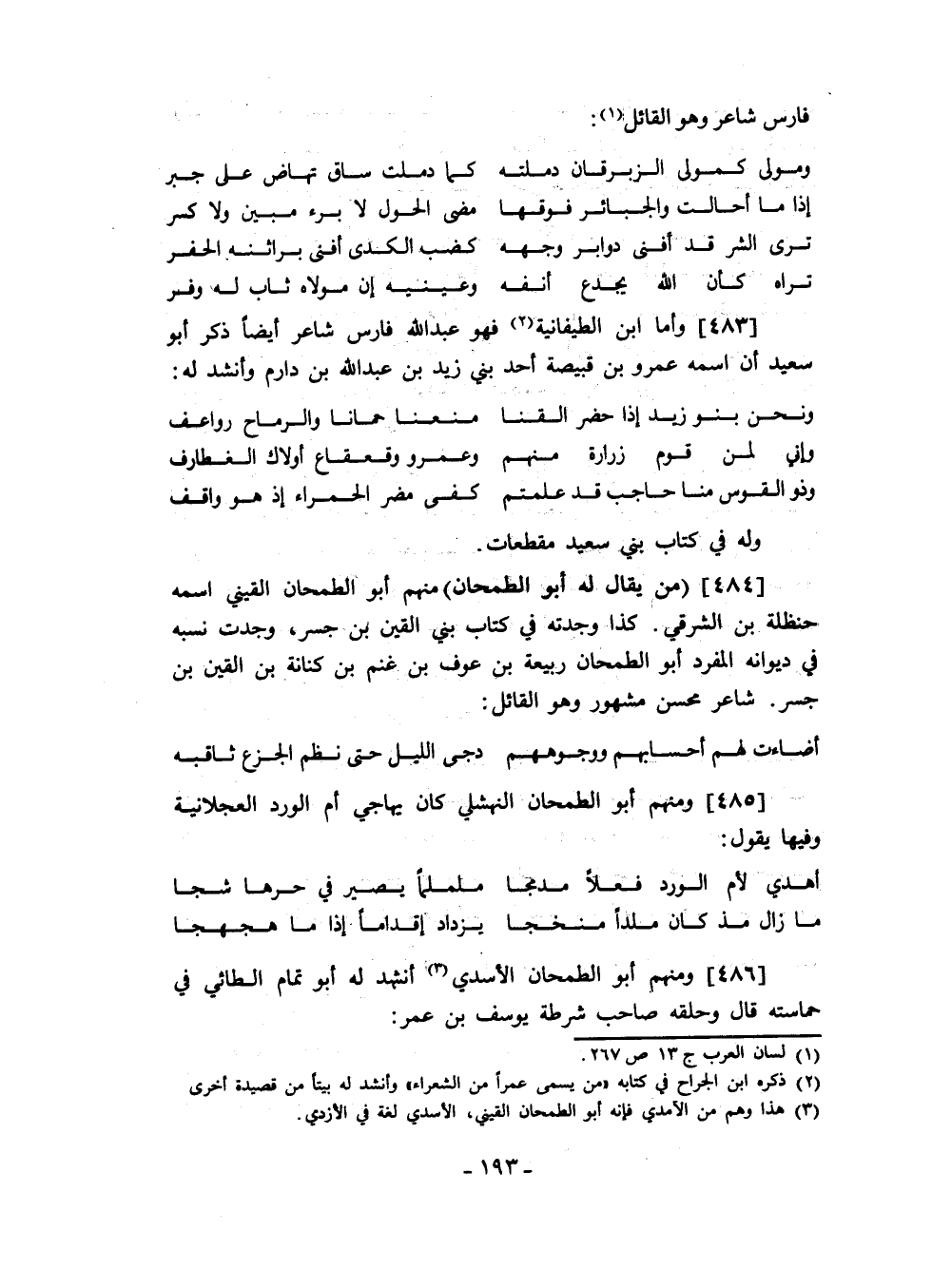 وأما ابن الطيفانية فهو عبد الله فارس شاعر أيضاً ذكر أبو سعيد أن اسمه عمرو بن قبيصة أحد بني زيد بن عبد الله بن دارم وأنشد له: