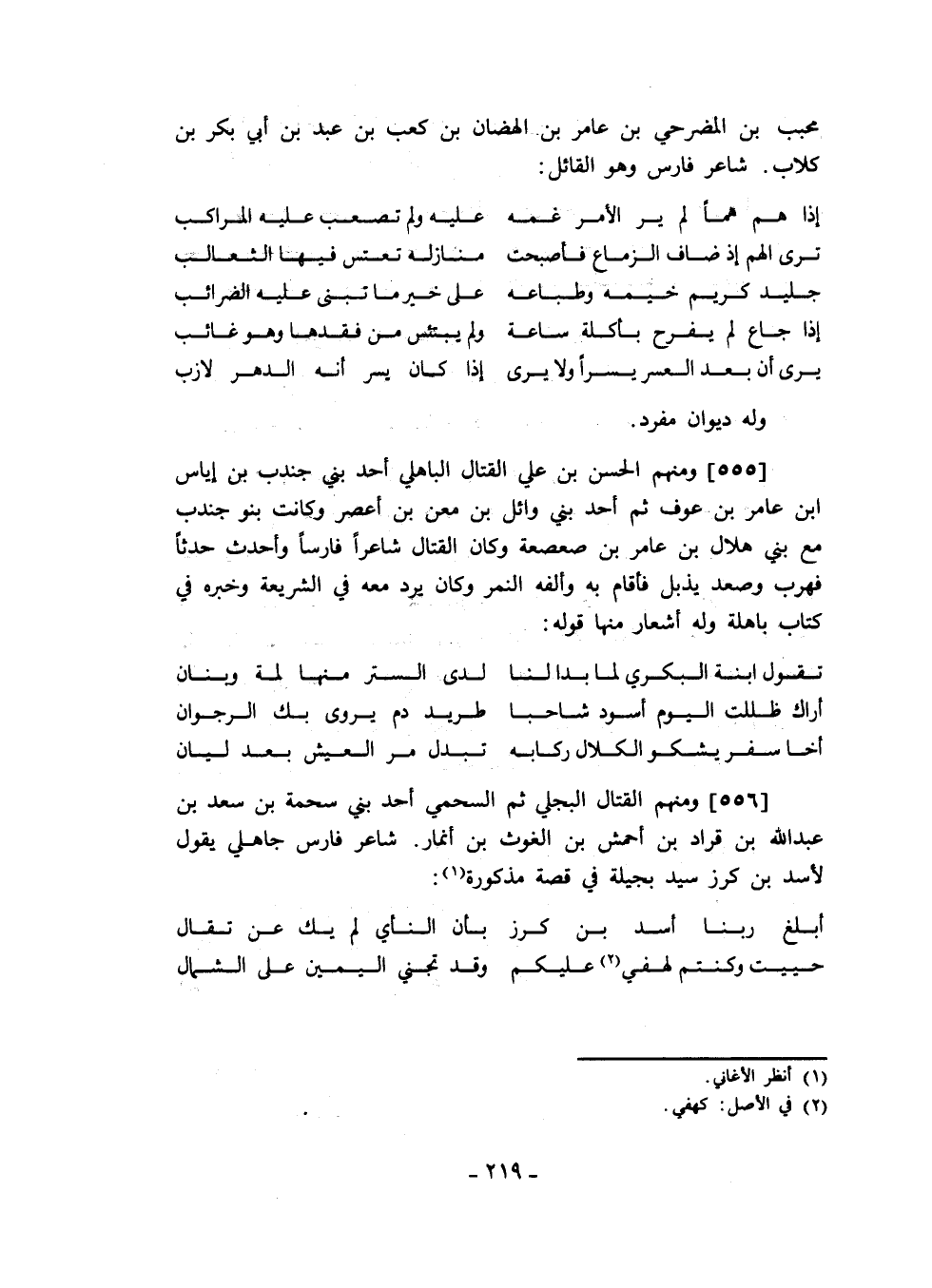 ومنهم الحسن بن علي القتال الباهلي أحد بني جندب بن إياس ابن عامر بن عوف ثم أحد بني وائل بن معن بن أعصر وكانت بنو جندب مع بني هلال بن عامر بن صعصعة وكان القتال شاعراً فارساً وأحدث حدثاً فهرب وصعد يذبل فأقام به وألفه النمر وكان يرد معه في الشريعة وخبره في كتاب باهلة وله أشعار منها قوله: