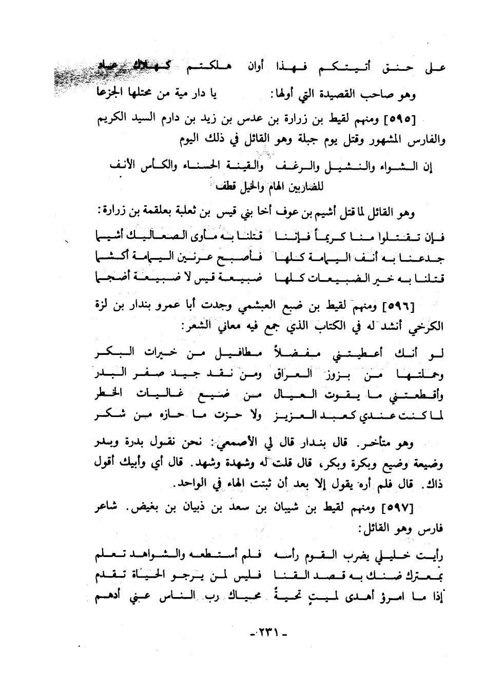 ومنهم لقيط بن ضبع العبشمي وجدت أبا عمرو بندار بن لزة الكرخي أنشد له في الكتاب الذي جمع فيه معاني الشعر: