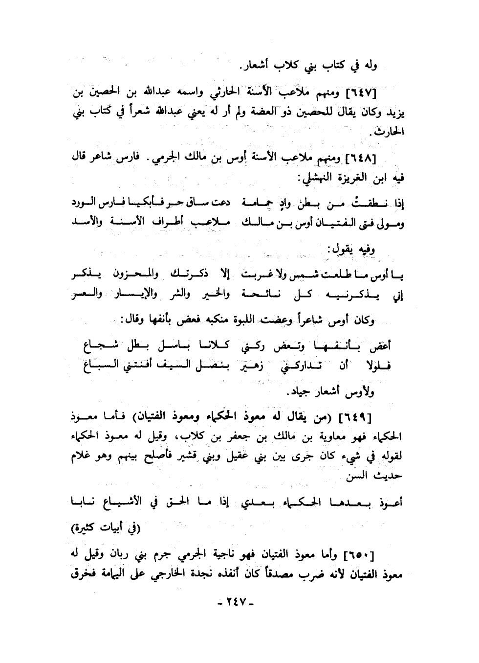 ومنهم ملاعب الأسنة الحارثي واسمه عبد الله بن الحصين بن يزيد وكان يقال للحصين ذو العضة ولم أر له يعني عبد الله شعراً في كتاب بني الحارث.