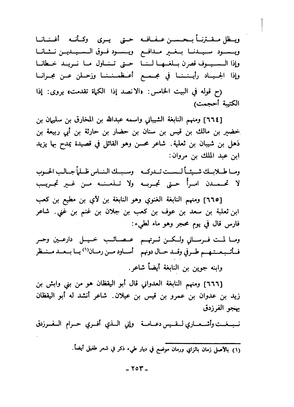 قوله في البيت الخامس: ألا نصد إذا الكماة تقدمت يروى: إذا الكتيبة أحجمت ومنهم النابغة الشيباني واسمه عبد الله بن المخارق بن سليمان بن خضير بن مالك بن قيس بن سنان بن حضار بن حارثة بن أبي ربيعة بن ذهل بن شيبان بن ثعلبة. شاعر محسن وهو القائل في قصيدة يمدح بها يزيد ابن عبد الملك بن مروان:
