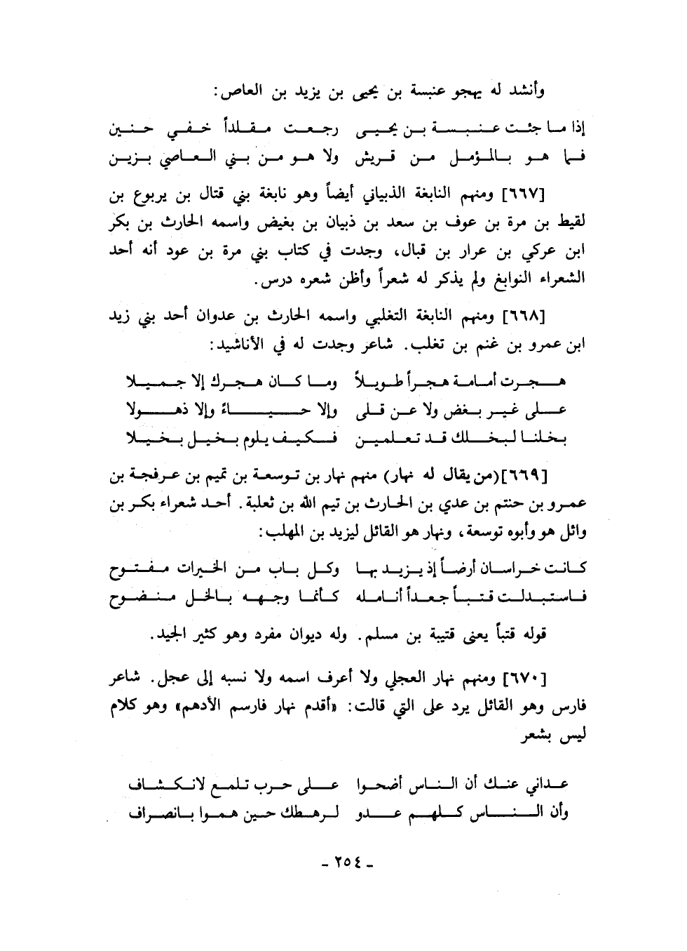 ومنهم النابغة الذبياني أيضاً وهو نابغة بني قتال بن يربوع بن لقيط بن مرة بن عوف بن سعد بن ذبيان بن بغيض واسمه الحارث بن بكر ابن عركي بن عرار بن قبال، وجدت في كتاب بني مرة بن عود أنه أحد الشعراء النوابغ ولم يذكر له شعراً وأظن شعره درس.