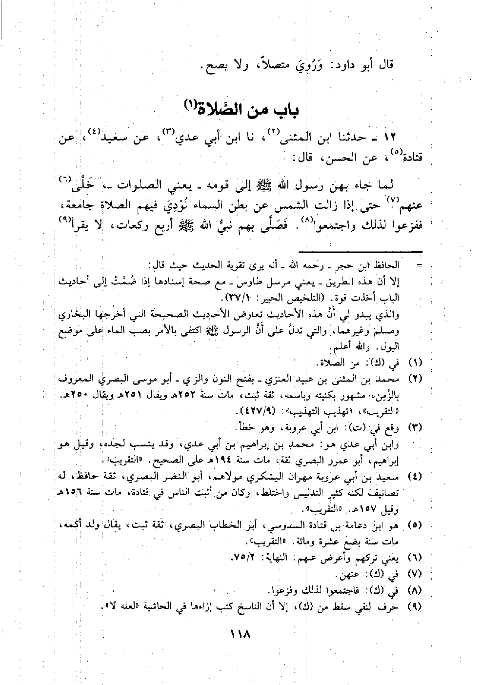 8- حَدَّثَنَا أَحْمَدُ بْنُ يُونُسَ، أخبرنَا زَائِدَةُ، في حَديث هِشَامٌ، عَنْ حَفْصَةَ بِنْتِ سِيرِينَ، عَنْ أَبِي العَالِيَةِ، قَالَ: جَاءَ رَجُلٌ فِي بَصَرِهِ ضَرٌّ، فَدَخَلَ المَسْجِدَ وَرَسُولُ اللهِ صَلى الله عَليهِ وسَلم يُصَلِّي بِأَصْحَابِهِ، فَتَرَدَّى فِي حُفْرَةٍ كَانَتْ فِي المَسْجِدِ، فَضَحِكَ طَوَائِفُ مِنْهُمْ، فَلَمَّا قَضَى رَسُولُ اللهِ صَلى الله عَليهِ وسَلم الصَّلاَةَ أَمَرَ مَنْ كَانَ ضَحِكَ مِنْهُمْ أَنْ يُعِيدَ الوُضُوءَ، وَيُعِيدَ الصَّلاَةَ.