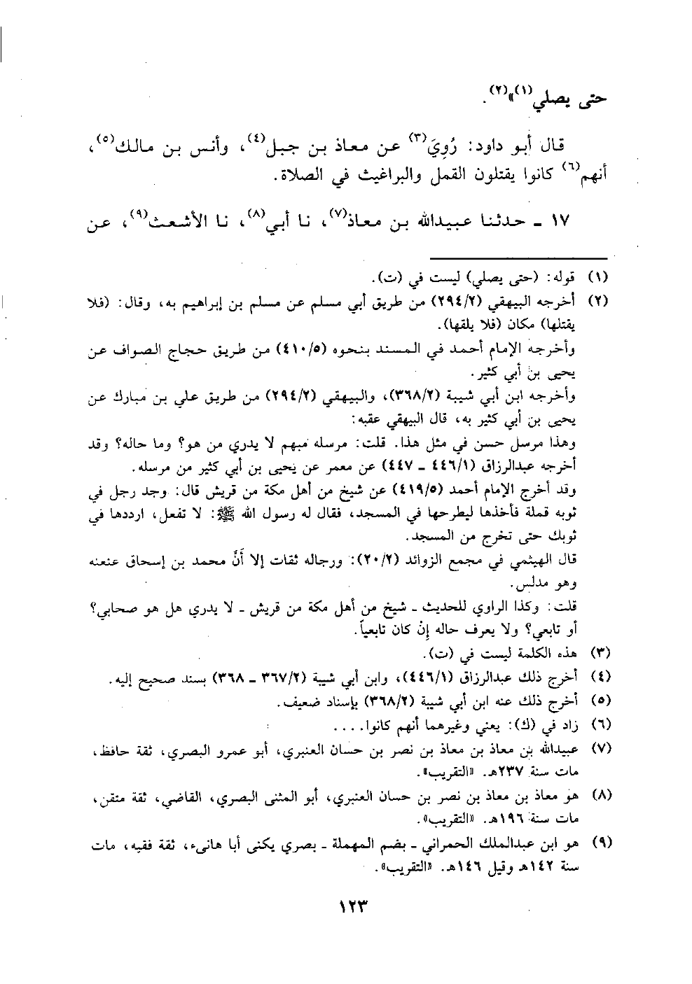 11- حَدَّثَنَا مُوسَى بْنُ إِسْمَاعِيلَ، قال: أخبرنَا جَرِيرٌ يَعْنِي ابْنَ حَازِمٍ، قال: سَمِعْتُ عَبْدَ المَلِكِ يَعْنِي ابْنَ عُمَيْرٍ، يُحَدِّثُ عَنْ عَبْدِ اللهِ بْنِ مَعْقِلِ بْنِ مُقَرِّنٍ، قَالَ: قَامَ أَعْرَابِيٌّ إِلَى زَاوِيَةٍ مِنْ زَوَايَا المَسْجِدِ فَاكْتَشَفَ، فَبَالَ فِيهَا، فَقَالَ النَّبِيُّ صَلى الله عَليهِ وسَلم: خُذُوا مَا بَالَ عَلَيْهِ مِنَ التُّرَابِ، فَأَلْقُوهُ، وَأَهْرِيقُوا عَلَى مَكَانِهِ مَاءً.