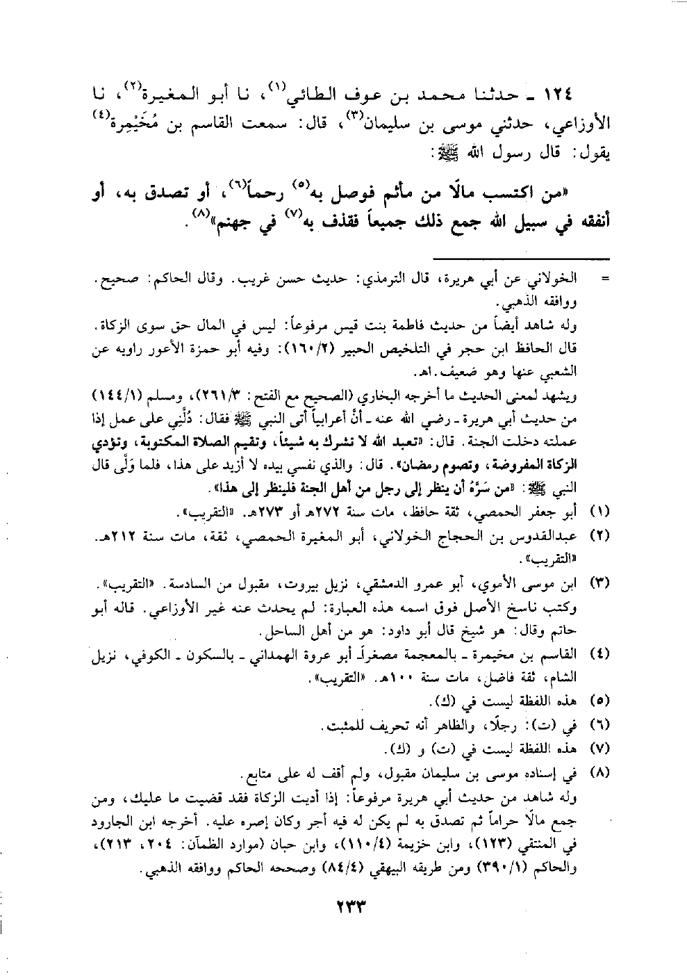 119- حَدَّثَنَا مُوسَى بْنُ إِسْمَاعِيلَ، أخبرنَا وُهَيْبٌ، حَدَّثَنِي رَجُلٌ، بِمِنًى كَانَ إِلَى جَنْبِ مُحَمَّدِ بْنِ أَبِي بَكْرٍ فَسَأَلْتُ مُحَمَّدَ بْنَ أَبِي بَكْرٍ عَنْهُ فَقَالَ: هَذَا فُلاَنُ بْنُ فُلاَنِ بْنِ عَبْدِ اللهِ بْنِ زَيْدٍ- صَاحِبِ الأَذَانِ- فَسَأَلْتُ ذَلِكَ الرَّجُلَ فَحَدَّثَنِي عَنْ أَبِيهِ، أَنَّ عَبْدَ اللهِ بْنَ زَيْدٍ، تَصَدَّقَ بِحَائِطٍ لَهُ، فَأَتَى أَبَوَاهُ النَّبِيَّ صَلى الله عَليهِ وسَلم فَقَالاَ: يَا رَسُولَ اللهِ مَا كَانَ يُقِيمُ وجُوهَنَا غَيْرُهُ، فَرَدَّهُ النَّبِيُّ صَلى الله عَليهِ وسَلم عَلَى أَبَوَيْهِ ثُمَّ مَاتَا فَوَرِثَهُمَا بَعْد.