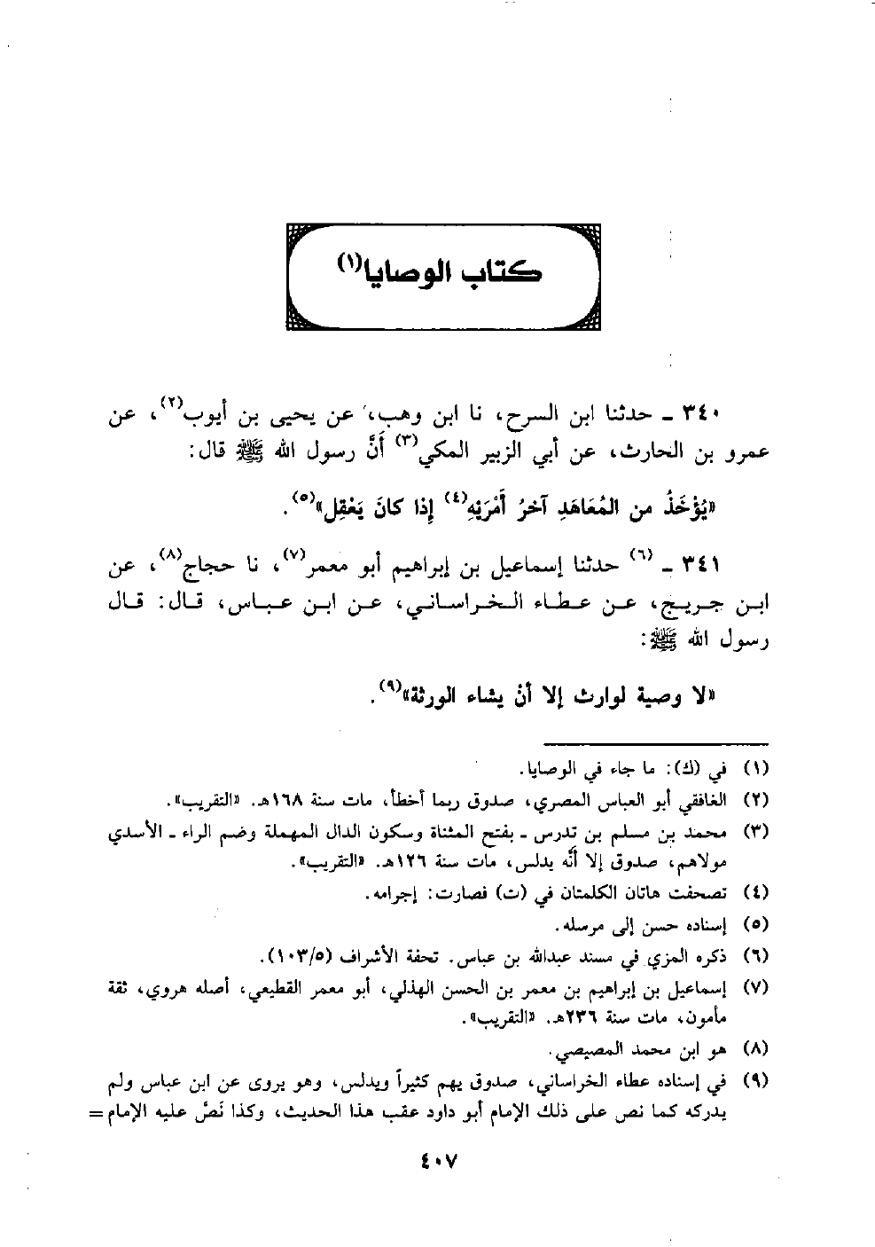 331- 1- حَدَّثَنَا هَنَّادٌ، عَنِ ابْنِ المُبَارَكِ، عَنْ يُونُسَ، عَنِ الزُّهْرِيِّ، أَنَّ المُغِيرَةَ، قَالَ: يَا رَسُولَ اللهِ، أَخْمِسْ هَذَا المَالَ الَّذِي أَصَبْتُ مِنْ رَكْبِ بَنِي مَالِكٍ الَّذِينَ قَتَلْتُ، فَأَبَى رَسُولُ اللهِ صَلى الله عَليهِ وسَلم أَنْ يخمسهُ مِنْ أَجْلِ أَنَّهُ مَالُ غَدْرٍ وَقَالَ: أَمَّا الإِسْلاَمُ فَسَنَقْبَلُهُ مِنْكَ.