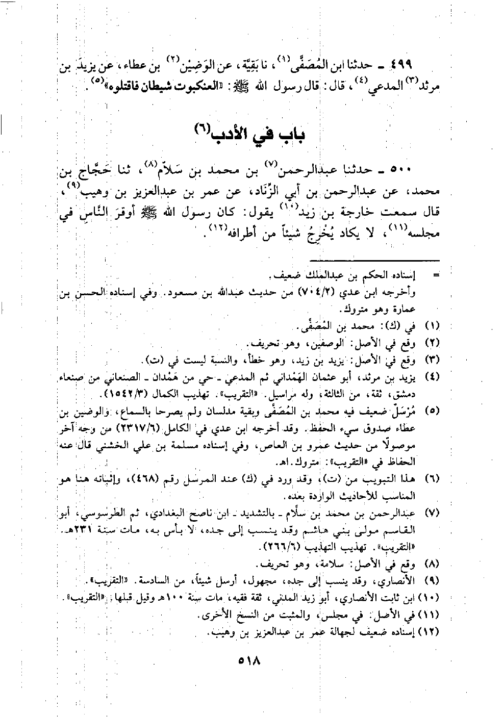 490- حَدَّثَنَا عَبْدُ اللهِ بْنُ مُحَمَّدٍ، وَعَلِيُّ بْنُ سَهْلٍ الرَّمْلَيَّانِ، قَالاَ: حَدَّثَنَا الوَلِيدُ، عَنْ عَبْدِ اللهِ بْنِ العَلاَءِ، عَنْ عَطِيَّةَ بْنِ قَيْسٍ، قَالَ: كَانَ حُجَرُ أَزْوَاجِ النَّبِيِّ صَلى الله عَليهِ وسَلم بِجَرِيدِ النَّخْلِ، فَخَرَجَ النَّبِيُّ صَلى الله عَليهِ وسَلم فِي مَغْزًى لَهُ وَكَانَتْ أُمُّ سَلَمَةَ مُوسِرَةً، فَجَعَلَتْ مَكَانَ الجَرِيدِ لَبِنًا فَقَالَ النَّبِيُّ صَلى الله عَليهِ وسَلم: مَا هَذَا؟ قَالَتْ: أَرَدْتُ أَنْ أَكُفَّ عَنِّي أَبْصَارَ النَّاسِ فَقَالَ: يَا أُمَّ سَلَمَةَ إِنَّ شَرَّ مَا ذَهَبَ فِيهِ مَالُ المَرْءِ المُسْلِمِ البُنْيَانُ.