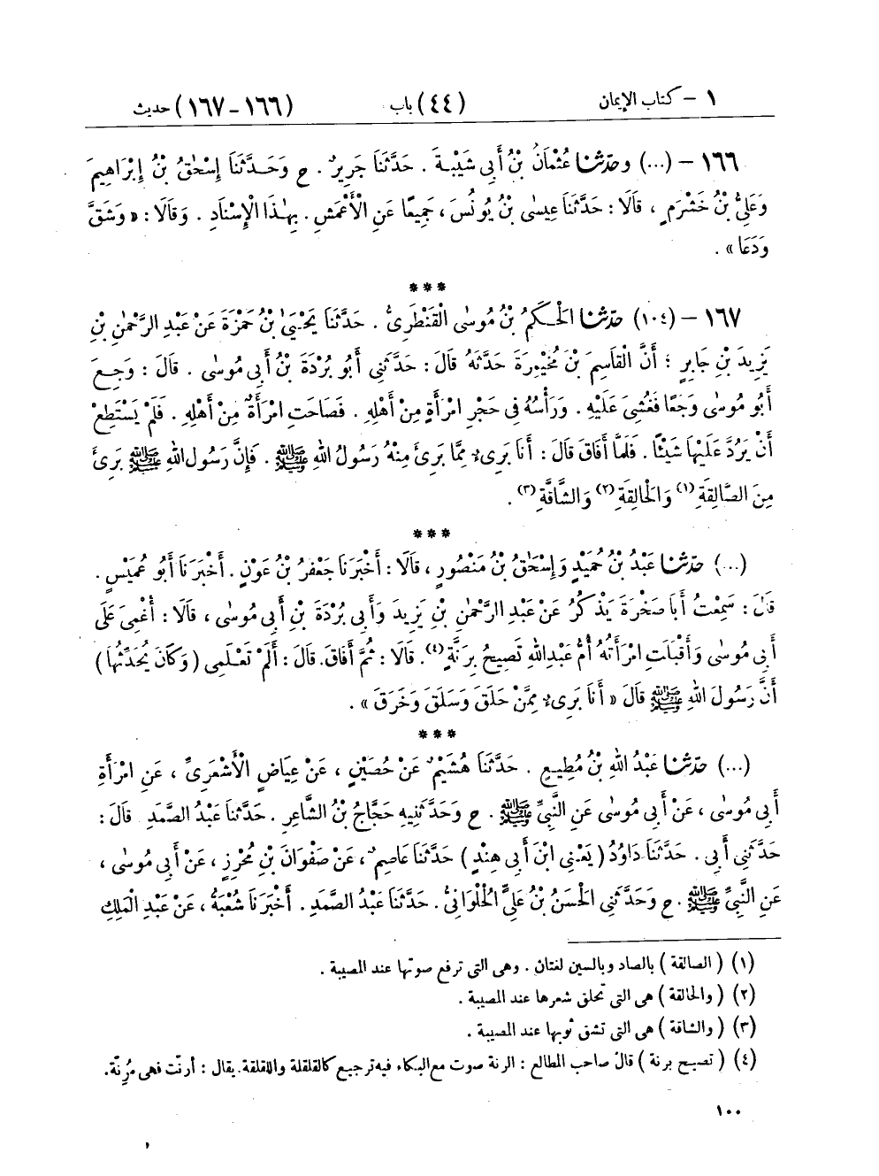 (١٠٤) حَدَّثَنَا عَبْدُ اللهِ بْنُ مُطِيعٍ، حَدَّثَنَا هُشَيْمٌ، عَنْ حُصَيْنٍ، عَنْ عِيَاضٍ الْأَشْعَرِيِّ، عَنِ امْرَأَةِ أَبِي مُوسَى، عَنْ أَبِي مُوسَى، عَنِ النَّبِيِّ صَلَّى اللهُ عَلَيْهِ وَسَلَّمَ، ح وَحَدَّثَنِيهِ حَجَّاجُ بْنُ الشَّاعِرِ، حَدَّثَنَا عَبْدُ الصَّمَدِ، قَالَ: حَدَّثَنِي أَبِي، حَدَّثَنَا دَاوُدُ يَعْنِي ابْنَ أَبِي هِنْدَ، حَدَّثَنَا عَاصِمٌ، عَنْ صَفْوَانَ بْنِ مُحْرِزٍ، عَنْ أَبِي مُوسَى، عَنِ النَّبِيِّ صَلَّى اللهُ عَلَيْهِ وَسَلَّمَ، ح وَحَدَّثَنِي الْحَسَنُ بْنُ عَلِيٍّ الْحُلْوَانِيُّ، حَدَّثَنَا عَبْدُ الصَّمَدِ، أَخْبَرَنَا شُعْبَةُ، عَنْ عَبْدِ الْمَلِكِ بْنِ عُمَيْرٍ، عَنْ رِبْعِيِّ بْنِ حِرَاشٍ، عَنْ أَبِي مُوسَى، عَنِ النَّبِيِّ صَلَّى اللهُ عَلَيْهِ وَسَلَّمَ بِهَذَا الْحَدِيثِ غَيْرَ أَنَّ فِي حَدِيثِ عِيَاضٍ الْأَشْعَرِيِّ قَالَ: «لَيْسَ مِنَّا» وَلَمْ يَقُلْ «بَرِيءٌ»
