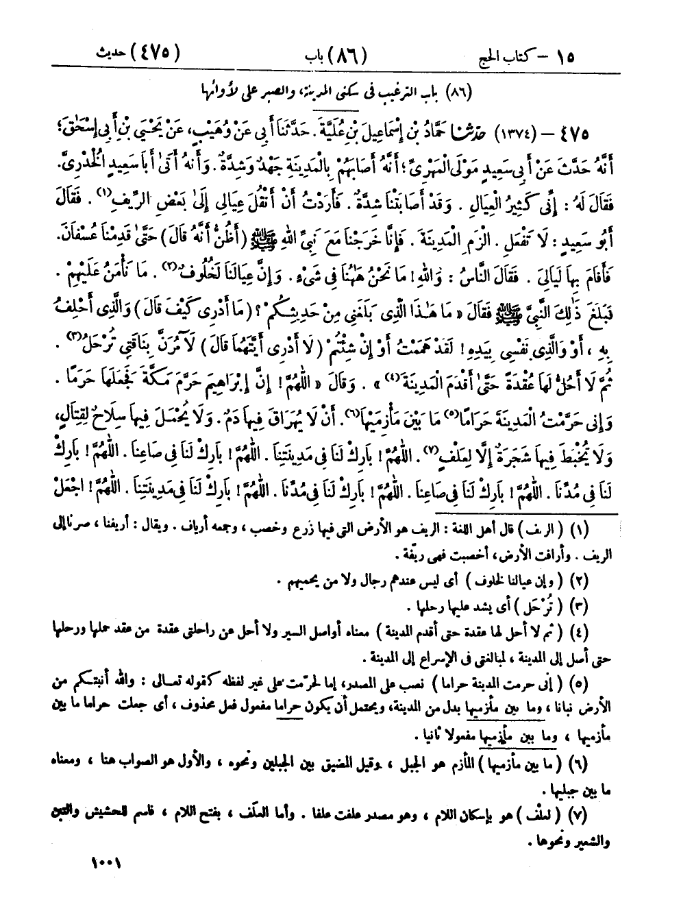 ٤٧٥ - (١٣٧٤) حَدَّثَنَا حَمَّادُ بْنُ إِسْمَاعِيلَ ابْنِ عُلَيَّةَ، حَدَّثَنَا أَبِي، عَنْ وُهَيْبٍ، عَنْ يَحْيَى بْنِ أَبِي إِسْحَاقَ، أَنَّهُ حَدَّثَ عَنْ أَبِي سَعِيدٍ، مَوْلَى الْمَهْرِيِّ، أَنَّهُ أَصَابَهُمْ بِالْمَدِينَةِ جَهْدٌ وَشِدَّةٌ، وَأَنَّهُ أَتَى أَبَا سَعِيدٍ الْخُدْرِيَّ، فَقَالَ لَهُ: إِنِّي كَثِيرُ الْعِيَالِ، وَقَدْ أَصَابَتْنَا شِدَّةٌ، فَأَرَدْتُ أَنْ أَنْقُلَ عِيَالِي إِلَى بَعْضِ الرِّيفِ، فَقَالَ أَبُو سَعِيدٍ: لَا تَفْعَلْ، الْزَمِ الْمَدِينَةَ، فَإِنَّا خَرَجْنَا مَعَ نَبِيِّ اللهِ صَلَّى اللهُ عَلَيْهِ وَسَلَّمَ - أَظُنُّ أَنَّهُ قَالَ - حَتَّى قَدِمْنَا عُسْفَانَ، فَأَقَامَ بِهَا لَيَالِيَ، فَقَالَ النَّاسُ: وَاللهِ مَا نَحْنُ هَا هُنَا فِي شَيْءٍ، وَإِنَّ عِيَالَنَا لَخُلُوفٌ مَا نَأْمَنُ عَلَيْهِمْ، فَبَلَغَ ذَلِكَ النَّبِيَّ صَلَّى اللهُ عَلَيْهِ وَسَلَّمَ، فَقَالَ: «مَا هَذَا الَّذِي بَلَغَنِي مِنْ حَدِيثِكُمْ؟» - مَا أَدْرِي كَيْفَ قَالَ - «وَالَّذِي أَحْلِفُ بِهِ - أَوْ وَالَّذِي نَفْسِي بِيَدِهِ - لَقَدْ هَمَمْتُ - أَوْ إِنْ شِئْتُمْ لَا أَدْرِي أَيَّتَهُمَا قَالَ - لَآمُرَنَّ بِنَاقَتِي تُرْحَلُ، ثُمَّ لَا أَحُلُّ لَهَا عُقْدَةً حَتَّى أَقْدَمَ الْمَدِينَةَ»، وَقَالَ: «اللهُمَّ إِنَّ إِبْرَاهِيمَ حَرَّمَ مَكَّةَ فَجَعَلَهَا حَرَمًا، وَإِنِّي حَرَّمْتُ الْمَدِينَةَ حَرَامًا مَا بَيْنَ مَأْزِمَيْهَا، أَنْ لَا يُهْرَاقَ فِيهَا دَمٌ، وَلَا يُحْمَلَ فِيهَا سِلَاحٌ لِقِتَالٍ، وَلَا تُخْبَطَ فِيهَا شَجَرَةٌ إِلَّا لِعَلْفٍ، اللهُمَّ بَارِكْ لَنَا فِي مَدِينَتِنَا، اللهُمَّ بَارِكْ لَنَا فِي صَاعِنَا، اللهُمَّ بَارِكْ لَنَا فِي مُدِّنَا، اللهُمَّ بَارِكْ لَنَا فِي صَاعِنَا، اللهُمَّ بَارِكْ لَنَا فِي مُدِّنَا، اللهُمَّ بَارِكْ لَنَا فِي مَدِينَتِنَا، اللهُمَّ اجْعَلْ مَعَ الْبَرَكَةِ بَرَكَتَيْنِ، وَالَّذِي نَفْسِي بِيَدِهِ، مَا مِنَ الْمَدِينَةِ شِعْبٌ، وَلَا نَقْبٌ إِلَّا عَلَيْهِ مَلَكَانِ يَحْرُسَانِهَا حَتَّى تَقْدَمُوا إِلَيْهَا»، ثُمَّ قَالَ لِلنَّاسِ: «ارْتَحِلُوا»، فَارْتَحَلْنَا، فَأَقْبَلْنَا إِلَى الْمَدِينَةِ، فَوَالَّذِي نَحْلِفُ بِهِ أَوْ يُحْلَفُ بِهِ - الشَّكُّ مِنْ حَمَّادٍ - مَا وَضَعْنَا رِحَالَنَا حِينَ دَخَلْنَا الْمَدِينَةَ حَتَّى أَغَارَ عَلَيْنَا بَنُو عَبْدِ اللهِ بْنِ غَطَفَانَ، وَمَا يَهِيجُهُمْ قَبْلَ ذَلِكَ شَيْءٌ