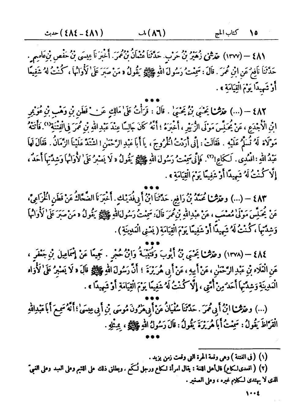 ٤٨١ - (١٣٧٧) حَدَّثَنِي زُهَيْرُ بْنُ حَرْبٍ، حَدَّثَنَا عُثْمَانُ بْنُ عُمَرَ، أَخْبَرَنَا عِيسَى بْنُ حَفْصِ بْنِ عَاصِمٍ، حَدَّثَنَا نَافِعٌ، عَنِ ابْنِ عُمَرَ، قَالَ: سَمِعْتُ رَسُولَ اللهِ صَلَّى اللهُ عَلَيْهِ وَسَلَّمَ يَقُولُ: «مَنْ صَبَرَ عَلَى لَأْوَائِهَا، كُنْتُ لَهُ شَفِيعًا أَوْ شَهِيدًا يَوْمَ الْقِيَامَةِ»