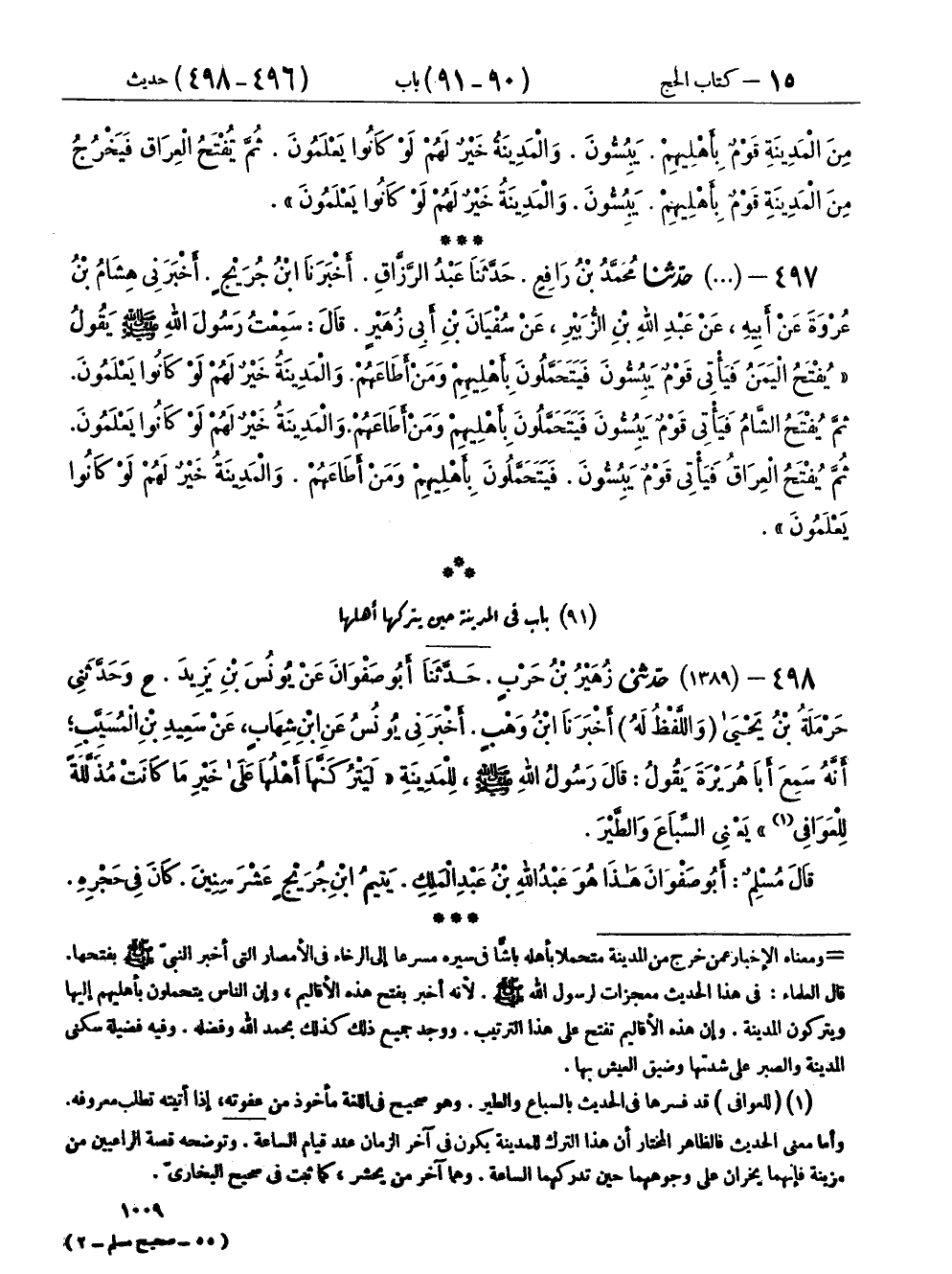 ٤٩٧ - (١٣٨٨) حَدَّثَنَا مُحَمَّدُ بْنُ رَافِعٍ، حَدَّثَنَا عَبْدُ الرَّزَّاقِ، أَخْبَرَنَا ابْنُ جُرَيْجٍ، أَخْبَرَنِي هِشَامُ بْنُ عُرْوَةَ، عَنْ أَبِيهِ، عَنْ عَبْدِ اللهِ بْنِ الزُّبَيْرِ، عَنْ سُفْيَانَ بْنِ أَبِي زُهَيْرٍ، قَالَ: سَمِعْتُ رَسُولَ اللهِ صَلَّى اللهُ عَلَيْهِ وَسَلَّمَ، يَقُولُ: «يُفْتَحُ الْيَمَنُ، فَيَأْتِي قَوْمٌ يَبُسُّونَ، فَيَتَحَمَّلُونَ بِأَهْلِيهِمْ وَمَنْ أَطَاعَهُمْ، وَالْمَدِينَةُ خَيْرٌ لَهُمْ لَوْ كَانُوا يَعْلَمُونَ، ثُمَّ يُفْتَحُ الشَّامُ، فَيَأْتِي قَوْمٌ يَبُسُّونَ، فَيَتَحَمَّلُونَ بِأَهْلِيهِمْ وَمَنْ أَطَاعَهُمْ، وَالْمَدِينَةُ خَيْرٌ لَهُمْ لَوْ كَانُوا يَعْلَمُونَ، ثُمَّ يُفْتَحُ الْعِرَاقُ، فَيَأْتِي قَوْمٌ يَبُسُّونَ، فَيَتَحَمَّلُونَ بِأَهْلِيهِمْ وَمَنْ أَطَاعَهُمْ، وَالْمَدِينَةُ خَيْرٌ لَهُمْ لَوْ كَانُوا يَعْلَمُونَ»