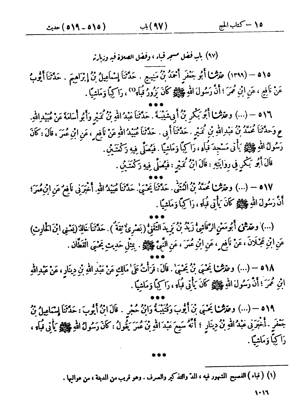 ٥١٦ - (١٣٩٩) وحَدَّثَنَا أَبُو بَكْرِ بْنُ أَبِي شَيْبَةَ، حَدَّثَنَا عَبْدُ اللهِ بْنُ نُمَيْرٍ، وَأَبُو أُسَامَةَ، عَنْ عُبَيْدِ اللهِ ح، وحَدَّثَنَا مُحَمَّدُ بْنُ عَبْدِ اللهِ بْنِ نُمَيْرٍ، حَدَّثَنَا أَبِي، حَدَّثَنَا عُبَيْدُ اللهِ، عَنْ نَافِعٍ، عَنِ ابْنِ عُمَرَ، قَالَ: «كَانَ رَسُولُ اللهِ صَلَّى اللهُ عَلَيْهِ وَسَلَّمَ يَأْتِي مَسْجِدَ قُبَاءٍ رَاكِبًا وَمَاشِيًا، فَيُصَلِّي فِيهِ رَكْعَتَيْنِ»، قَالَ أَبُو بَكْرٍ فِي رِوَايَتِهِ: قَالَ ابْنُ نُمَيْرٍ: فَيُصَلِّي فِيهِ رَكْعَتَيْنِ