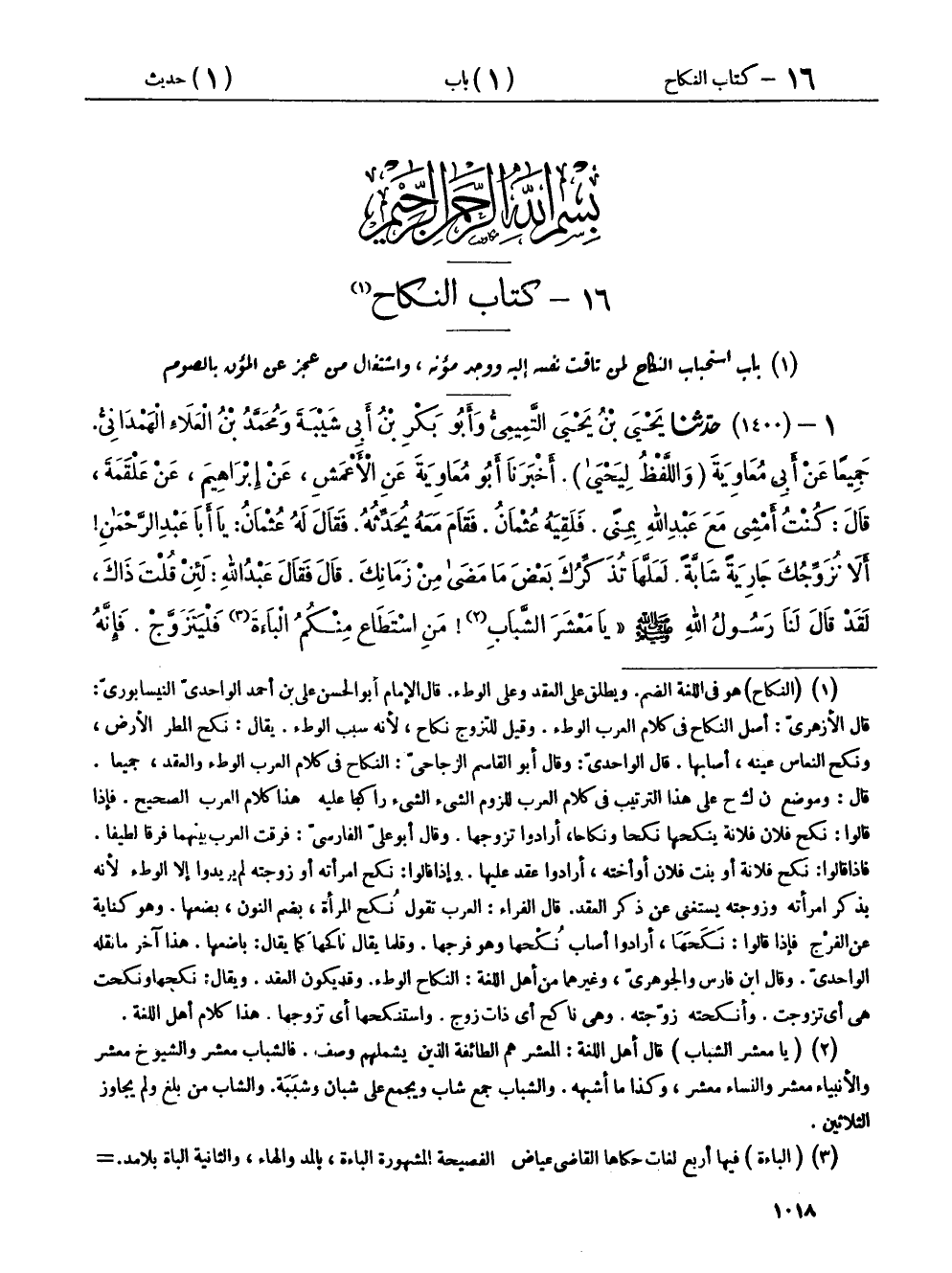 ١ - (١٤٠٠) حَدَّثَنَا يَحْيَى بْنُ يَحْيَى التَّمِيمِيُّ، وَأَبُو بَكْرِ بْنُ أَبِي شَيْبَةَ، وَمُحَمَّدُ بْنُ الْعَلَاءِ الْهَمْدَانِيُّ، جَمِيعًا عَنْ أَبِي مُعَاوِيَةَ، وَاللَّفْظُ لِيَحْيَى، أَخْبَرَنَا أَبُو مُعَاوِيَةَ، عَنِ الْأَعْمَشِ، عَنْ إِبْرَاهِيمَ، عَنْ عَلْقَمَةَ، قَالَ: كُنْتُ أَمْشِي مَعَ عَبْدِ اللهِ بِمِنًى، فَلَقِيَهُ عُثْمَانُ، فَقَامَ مَعَهُ يُحَدِّثُهُ، فَقَالَ لَهُ عُثْمَانُ: يَا أَبَا عَبْدِ الرَّحْمَنِ، أَلَا نُزَوِّجُكَ جَارِيَةً شَابَّةً، لَعَلَّهَا تُذَكِّرُكَ بَعْضَ مَا مَضَى مِنْ زَمَانِكَ، قَالَ: فَقَالَ عَبْدُ اللهِ: لَئِنْ قُلْتَ ذَاكَ، لَقَدْ قَالَ لَنَا رَسُولُ اللهِ صَلَّى اللهُ عَلَيْهِ وَسَلَّمَ: «يَا مَعْشَرَ الشَّبَابِ، مَنِ اسْتَطَاعَ مِنْكُمُ الْبَاءَةَ فَلْيَتَزَوَّجْ، فَإِنَّهُ أَغَضُّ لِلْبَصَرِ، وَأَحْصَنُ لِلْفَرْجِ، وَمَنْ لَمْ يَسْتَطِعْ فَعَلَيْهِ بِالصَّوْمِ، فَإِنَّهُ لَهُ وِجَاءٌ»،