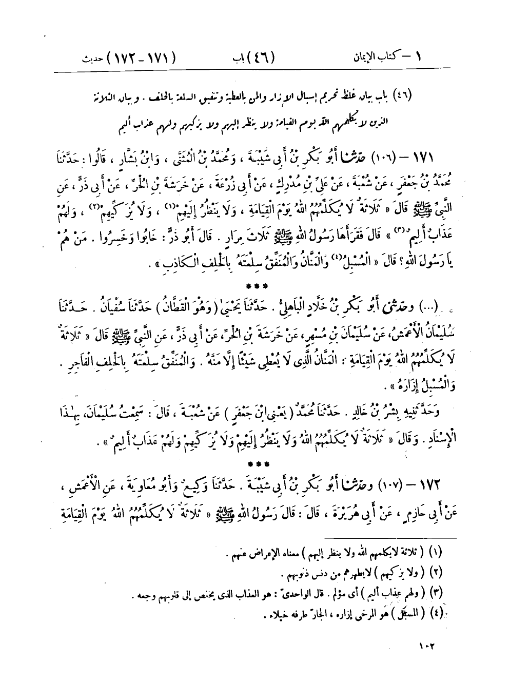 ١٧١ - (١٠٦) حَدَّثَنَا أَبُو بَكْرِ بْنُ أَبِي شَيْبَةَ، وَمُحَمَّدُ بْنُ الْمُثَنَّى، وَابْنُ بَشَّارٍ، قَالُوا: حَدَّثَنَا مُحَمَّدُ بْنُ جَعْفَرٍ، عَنْ شُعْبَةَ، عَنْ عَلِيِّ بْنِ مُدْرِكٍ، عَنْ أَبِي زُرْعَةَ، عَنْ خَرَشَةَ بْنِ الْحُرِّ، عَنْ أَبِي ذَرٍّ، عَنِ النَّبِيِّ صَلَّى اللهُ عَلَيْهِ وَسَلَّمَ قَالَ: «ثَلَاثَةٌ لَا يُكَلِّمُهُمُ اللهُ يَوْمَ الْقِيَامَةِ، وَلَا يَنْظُرُ إِلَيْهِمْ وَلَا يُزَكِّيهِمْ وَلَهُمْ عَذَابٌ أَلِيمٌ» قَالَ: فَقَرَأَهَا رَسُولُ اللهِ صَلَّى اللهُ عَلَيْهِ وَسَلَّمَ ثَلَاثَ مِرَارًا، قَالَ أَبُو ذَرٍّ: خَابُوا وَخَسِرُوا، مَنْ هُمْ يَا رَسُولَ اللهِ؟ قَالَ: «الْمُسْبِلُ، وَالْمَنَّانُ، وَالْمُنَفِّقُ سِلْعَتَهُ بِالْحَلِفِ الْكَاذِبِ»