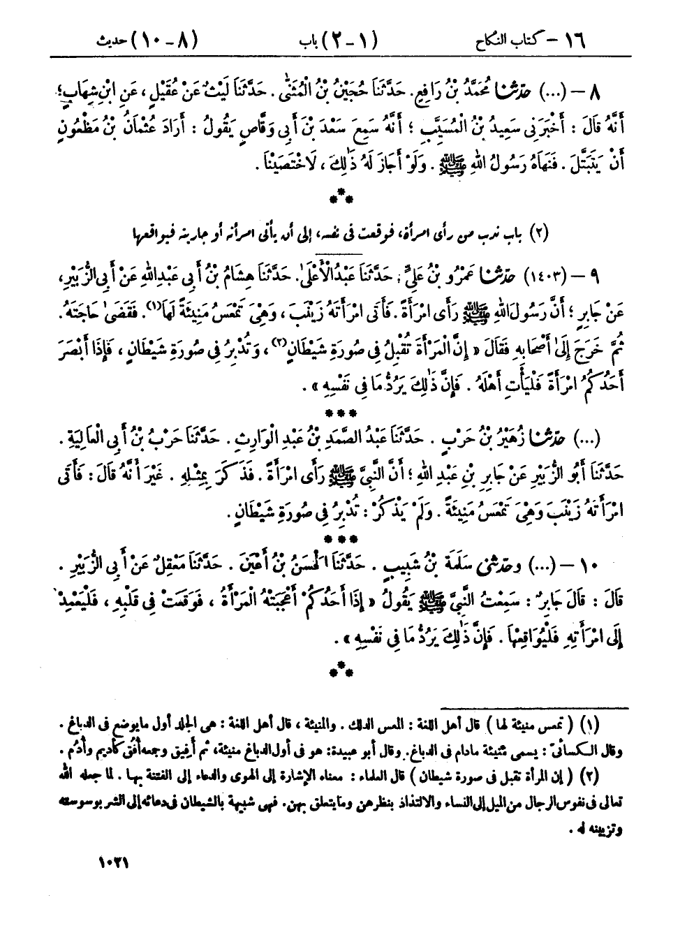 ٩ - (١٤٠٣) حَدَّثَنَا عَمْرُو بْنُ عَلِيٍّ، حَدَّثَنَا عَبْدُ الْأَعْلَى، حَدَّثَنَا هِشَامُ بْنُ أَبِي عَبْدِ اللهِ، عَنْ أَبِي الزُّبَيْرِ، عَنْ جَابِرٍ، أَنَّ رَسُولَ اللهِ صَلَّى اللهُ عَلَيْهِ وَسَلَّمَ رَأَى امْرَأَةً، فَأَتَى امْرَأَتَهُ زَيْنَبَ، وَهِيَ تَمْعَسُ مَنِيئَةً لَهَا، فَقَضَى حَاجَتَهُ، ثُمَّ خَرَجَ إِلَى أَصْحَابِهِ، فَقَالَ: «إِنَّ الْمَرْأَةَ تُقْبِلُ فِي صُورَةِ شَيْطَانٍ، وَتُدْبِرُ فِي صُورَةِ شَيْطَانٍ، فَإِذَا أَبْصَرَ أَحَدُكُمُ امْرَأَةً فَلْيَأْتِ أَهْلَهُ، فَإِنَّ ذَلِكَ يَرُدُّ مَا فِي نَفْسِهِ»،
