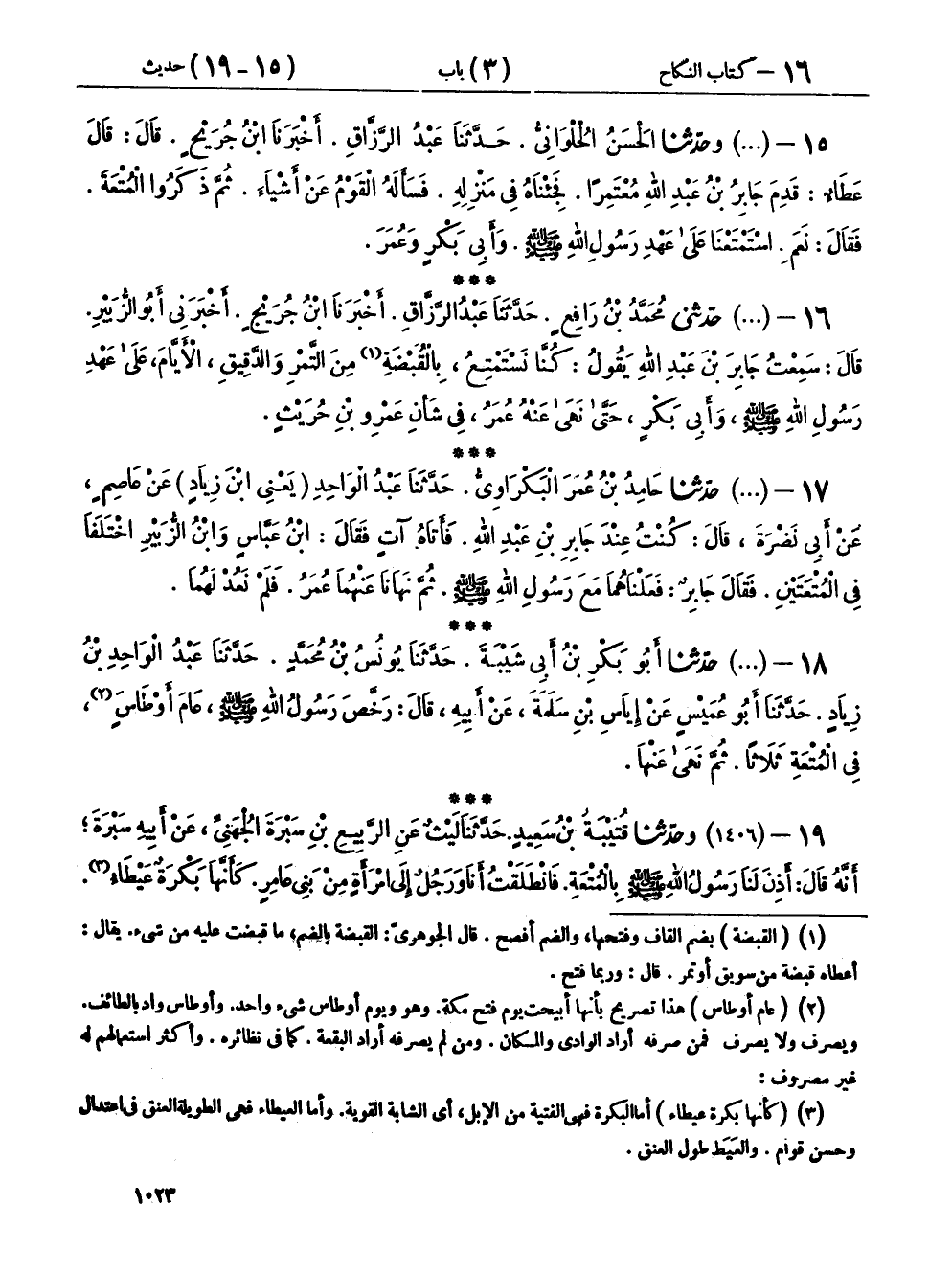١٦ - (١٤٠٥) حَدَّثَنِي مُحَمَّدُ بْنُ رَافِعٍ، حَدَّثَنَا عَبْدُ الرَّزَّاقِ، أَخْبَرَنَا ابْنُ جُرَيْجٍ، أَخْبَرَنِي أَبُو الزُّبَيْرِ، قَالَ: سَمِعْتُ جَابِرَ بْنَ عَبْدِ اللهِ، يَقُولُ: «كُنَّا نَسْتَمْتِعُ بِالْقَبْضَةِ مِنَ التَّمْرِ وَالدَّقِيقِ، الْأَيَّامَ عَلَى عَهْدِ رَسُولِ اللهِ صَلَّى اللهُ عَلَيْهِ وَسَلَّمَ، وَأَبِي بَكْرٍ، حَتَّى نَهَى عَنْهُ عُمَرُ، فِي شَأْنِ عَمْرِو بْنِ حُرَيْثٍ»