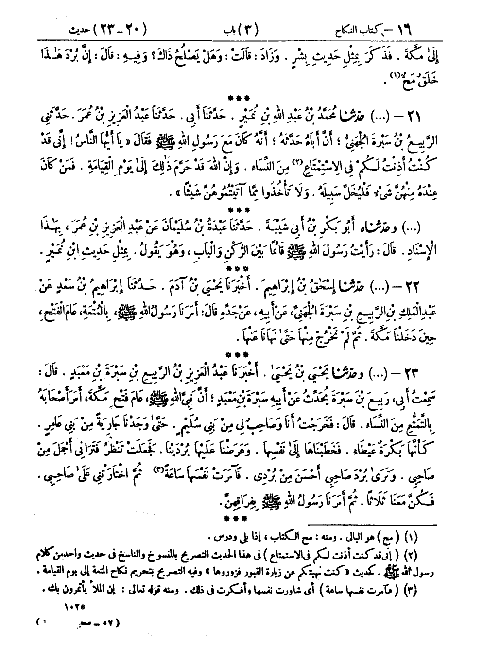 ٢١ - (١٤٠٦) حَدَّثَنَا مُحَمَّدُ بْنُ عَبْدِ اللهِ بْنِ نُمَيْرٍ، حَدَّثَنَا أَبِي، حَدَّثَنَا عَبْدُ الْعَزِيزِ بْنُ عُمَرَ، حَدَّثَنِي الرَّبِيعُ بْنُ سَبْرَةَ الْجُهَنِيُّ، أَنَّ أَبَاهُ، حَدَّثَهُ، أَنَّهُ كَانَ مَعَ رَسُولِ اللهِ صَلَّى اللهُ عَلَيْهِ وَسَلَّمَ فَقَالَ: «يَا أَيُّهَا النَّاسُ، إِنِّي قَدْ كُنْتُ أَذِنْتُ لَكُمْ فِي الِاسْتِمْتَاعِ مِنَ النِّسَاءِ، وَإِنَّ اللهَ قَدْ حَرَّمَ ذَلِكَ إِلَى يَوْمِ الْقِيَامَةِ، فَمَنْ كَانَ عِنْدَهُ مِنْهُنَّ شَيْءٌ فَلْيُخَلِّ سَبِيلَهُ، وَلَا تَأْخُذُوا مِمَّا آتَيْتُمُوهُنَّ شَيْئًا»،