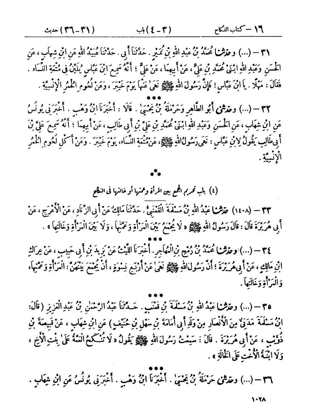 ٣٤ - (١٤٠٨) وحَدَّثَنَا مُحَمَّدُ بْنُ رُمْحِ بْنِ الْمُهَاجِرِ، أَخْبَرَنَا اللَّيْثُ، عَنْ يَزِيدَ بْنِ أَبِي حَبِيبٍ، عَنْ عِرَاكِ بْنِ مَالِكٍ، عَنْ أَبِي هُرَيْرَةَ، " أَنَّ رَسُولَ اللهِ صَلَّى اللهُ عَلَيْهِ وَسَلَّمَ نَهَى عَنْ أَرْبَعِ نِسْوَةٍ، أَنْ يُجْمَعَ بَيْنَهُنَّ: الْمَرْأَةِ وَعَمَّتِهَا، وَالْمَرْأَةِ وَخَالَتِهَا "