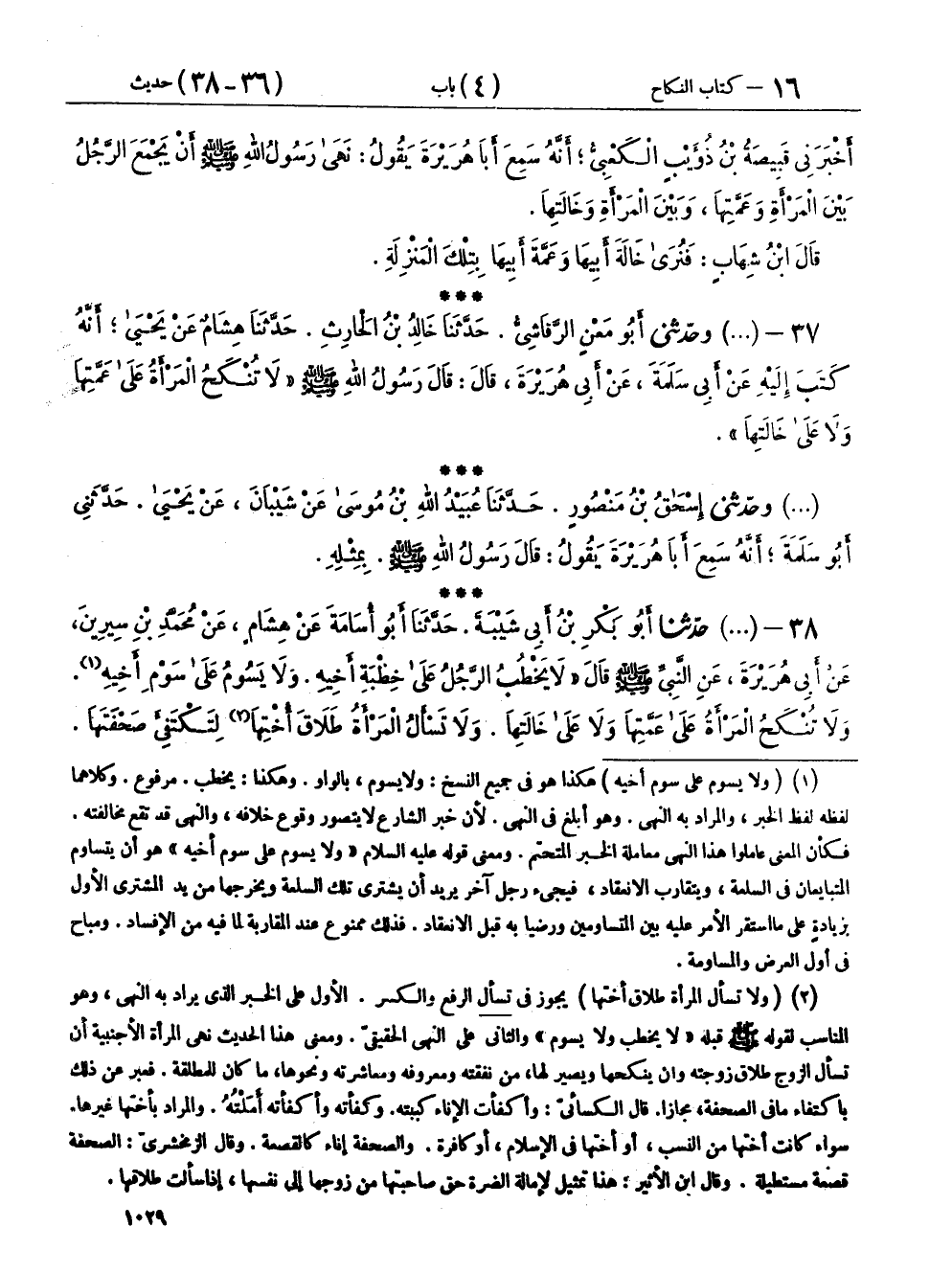 ٣٨ - (١٤٠٨) حَدَّثَنَا أَبُو بَكْرِ بْنُ أَبِي شَيْبَةَ، حَدَّثَنَا أَبُو أُسَامَةَ، عَنْ هِشَامٍ، عَنْ مُحَمَّدِ بْنِ سِيرِينَ، عَنْ أَبِي هُرَيْرَةَ، عَنِ النَّبِيِّ صَلَّى اللهُ عَلَيْهِ وَسَلَّمَ قَالَ: «لَا يَخْطُبُ الرَّجُلُ عَلَى خِطْبَةِ أَخِيهِ، وَلَا يَسُومُ عَلَى سَوْمِ أَخِيهِ، وَلَا تُنْكَحُ الْمَرْأَةُ عَلَى عَمَّتِهَا وَلَا عَلَى خَالَتِهَا، وَلَا تَسْأَلُ الْمَرْأَةُ طَلَاقَ أُخْتِهَا لِتَكْتَفِئَ صَحْفَتَهَا وَلْتَنْكِحْ، فَإِنَّمَا لَهَا مَا كَتَبَ اللهُ لَهَا»