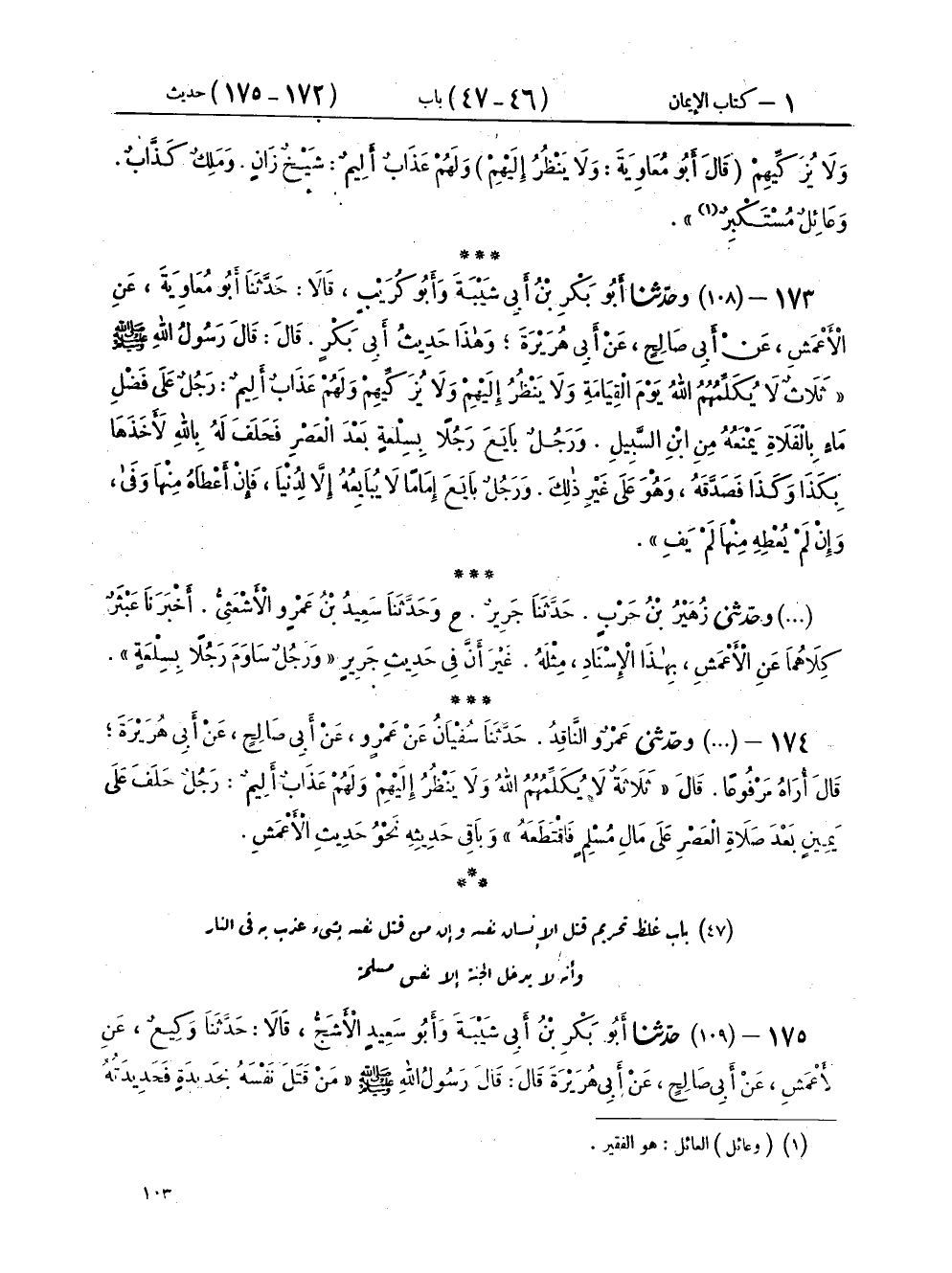 ١٧٣ - (١٠٨) وَحَدَّثَنَا أَبُو بَكْرِ بْنُ أَبِي شَيْبَةَ، وَأَبُو كُرَيْبٍ، قَالَا: حَدَّثَنَا أَبُو مُعَاوِيَةَ، عَنِ الْأَعْمَشِ، عَنْ أَبِي صَالِحٍ، عَنْ أَبِي هُرَيْرَةَ، وَهَذَا حَدِيثُ أَبِي بَكْرٍ، قَالَ: قَالَ رَسُولُ اللهِ صَلَّى اللهُ عَلَيْهِ وَسَلَّمَ: " ثَلَاثٌ لَا يُكَلِّمُهُمُ اللهُ يَوْمَ الْقِيَامَةِ، وَلَا يَنْظُرُ إِلَيْهِمْ، وَلَا يُزَكِّيهِمْ وَلَهُمْ عَذَابٌ أَلِيمٌ: رَجُلٌ عَلَى فَضْلِ مَاءٍ بِالْفَلَاةِ يَمْنَعُهُ مِنَ ابْنِ السَّبِيلِ، وَرَجُلٌ بَايَعَ رَجُلًا بِسِلْعَةٍ بَعْدَ الْعَصْرِ فَحَلَفَ لَهُ بِاللهِ لَأَخَذَهَا بِكَذَا وَكَذَا فَصَدَّقَهُ وَهُوَ عَلَى غَيْرِ ذَلِكَ، وَرَجُلٌ بَايَعَ إِمَامًا لَا يُبَايِعُهُ إِلَّا لِدُنْيَا فَإِنْ أَعْطَاهُ مِنْهَا وَفَى، وَإِنْ لَمْ يُعْطِهِ مِنْهَا لَمْ يَفِ "