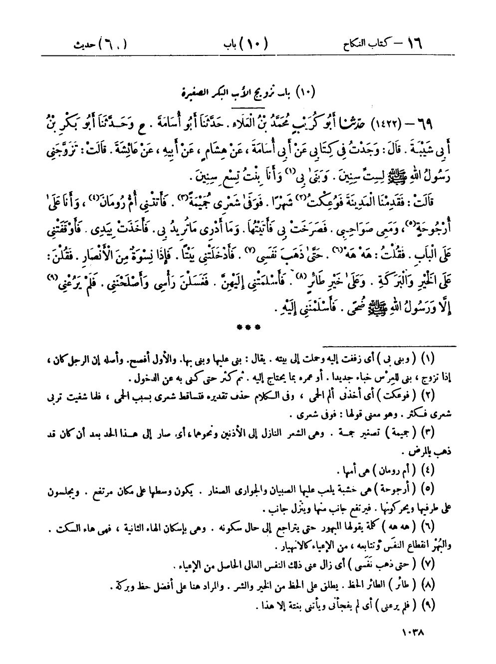 ٦٩ - (١٤٢٢) حَدَّثَنَا أَبُو كُرَيْبٍ مُحَمَّدُ بْنُ الْعَلَاءِ، حَدَّثَنَا أَبُو أُسَامَةَ، ح وحَدَّثَنَا أَبُو بَكْرِ بْنُ أَبِي شَيْبَةَ، قَالَ: وَجَدْتُ فِي كِتَابِي عَنْ أَبِي أُسَامَةَ، عَنْ هِشَامٍ، عَنْ أَبِيهِ، عَنْ عَائِشَةَ، قَالَتْ: «تَزَوَّجَنِي رَسُولُ اللهِ صَلَّى اللهُ عَلَيْهِ وَسَلَّمَ لِسِتِّ سِنِينَ، وَبَنَى بِي وَأَنَا بِنْتُ تِسْعِ سِنِينَ»، قَالَتْ: " فَقَدِمْنَا الْمَدِينَةَ، فَوُعِكْتُ شَهْرًا، فَوَفَى شَعْرِي جُمَيْمَةً، فَأَتَتْنِي أُمُّ رُومَانَ، وَأَنَا عَلَى أُرْجُوحَةٍ، وَمَعِي صَوَاحِبِي، فَصَرَخَتْ بِي فَأَتَيْتُهَا، وَمَا أَدْرِي مَا تُرِيدُ بِي فَأَخَذَتْ بِيَدِي، فَأَوْقَفَتْنِي عَلَى الْبَابِ، فَقُلْتُ: هَهْ هَهْ، حَتَّى ذَهَبَ نَفَسِي، فَأَدْخَلَتْنِي بَيْتًا، فَإِذَا نِسْوَةٌ مِنَ الْأَنْصَارِ، فَقُلْنَ: عَلَى الْخَيْرِ وَالْبَرَكَةِ، وَعَلَى خَيْرِ طَائِرٍ، فَأَسْلَمَتْنِي إِلَيْهِنَّ، فَغَسَلْنَ رَأْسِي وَأَصْلَحْنَنِي، فَلَمْ يَرُعْنِي إِلَّا وَرَسُولُ اللهِ صَلَّى اللهُ عَلَيْهِ وَسَلَّمَ ضُحًى، فَأَسْلَمْنَنِي إِلَيْهِ "