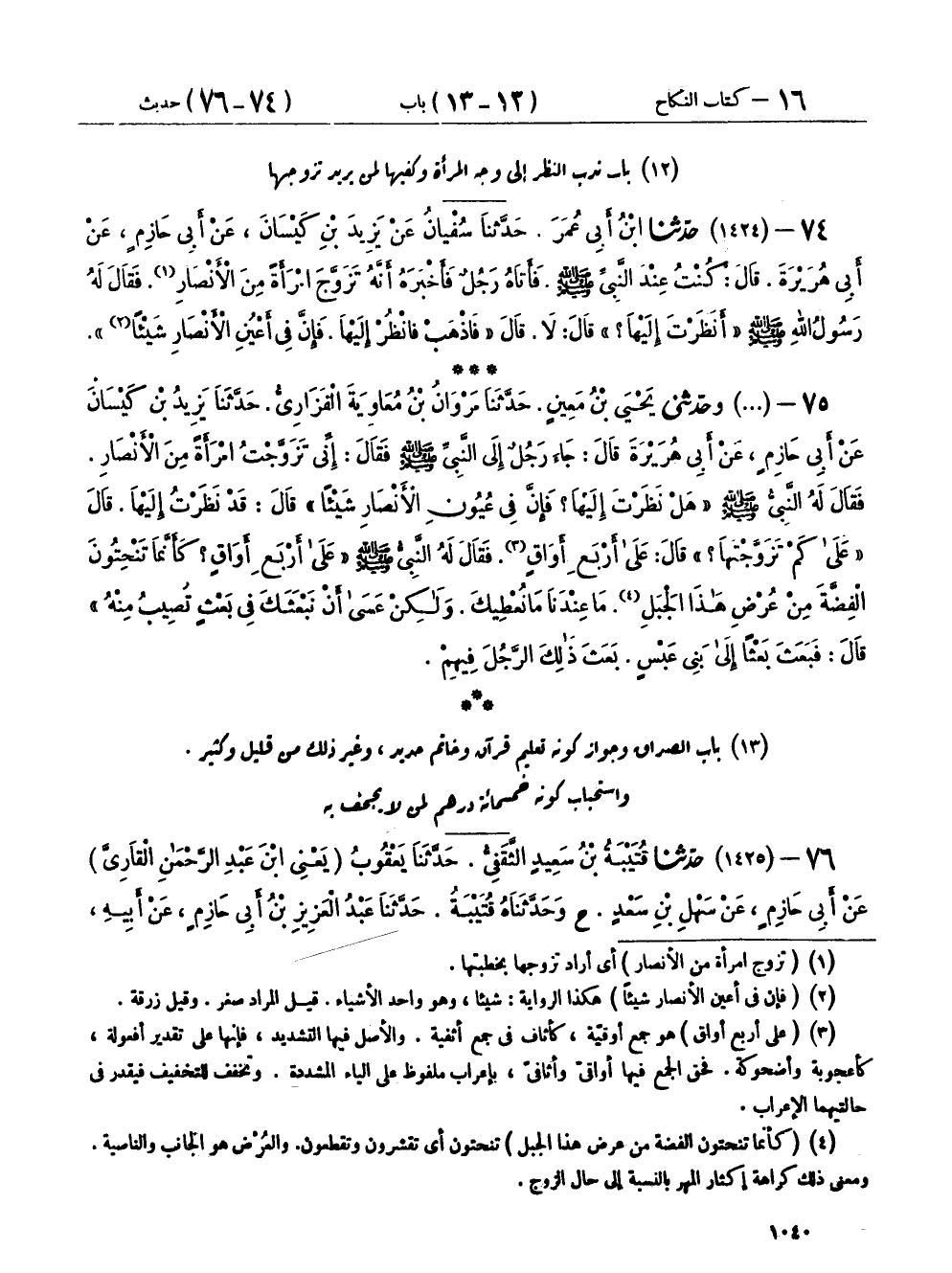 ٧٥ - (١٤٢٤) وحَدَّثَنِي يَحْيَى بْنُ مَعِينٍ، حَدَّثَنَا مَرْوَانُ بْنُ مُعَاوِيَةَ الْفَزَارِيُّ، حَدَّثَنَا يَزِيدُ بْنُ كَيْسَانَ، عَنْ أَبِي حَازِمٍ، عَنْ أَبِي هُرَيْرَةَ، قَالَ: جَاءَ رَجُلٌ إِلَى النَّبِيِّ صَلَّى اللهُ عَلَيْهِ وَسَلَّمَ، فَقَالَ: إِنِّي تَزَوَّجْتُ امْرَأَةً مِنَ الْأَنْصَارِ، فَقَالَ لَهُ النَّبِيُّ صَلَّى اللهُ عَلَيْهِ وَسَلَّمَ: «هَلْ نَظَرْتَ إِلَيْهَا؟ فَإِنَّ فِي عُيُونِ الْأَنْصَارِ شَيْئًا» قَالَ: قَدْ نَظَرْتُ إِلَيْهَا، قَالَ: «عَلَى كَمْ تَزَوَّجْتَهَا؟» قَالَ: عَلَى أَرْبَعِ أَوَاقٍ، فَقَالَ لَهُ النَّبِيُّ صَلَّى اللهُ عَلَيْهِ وَسَلَّمَ: «عَلَى أَرْبَعِ أَوَاقٍ؟ كَأَنَّمَا تَنْحِتُونَ الْفِضَّةَ مِنْ عُرْضِ هَذَا الْجَبَلِ، مَا عِنْدَنَا مَا نُعْطِيكَ، وَلَكِنْ عَسَى أَنْ نَبْعَثَكَ فِي بَعْثٍ تُصِيبُ مِنْهُ»، قَالَ: فَبَعَثَ بَعْثًا إِلَى بَنِي عَبْسٍ بَعَثَ ذَلِكَ الرَّجُلَ فِيهِمْ