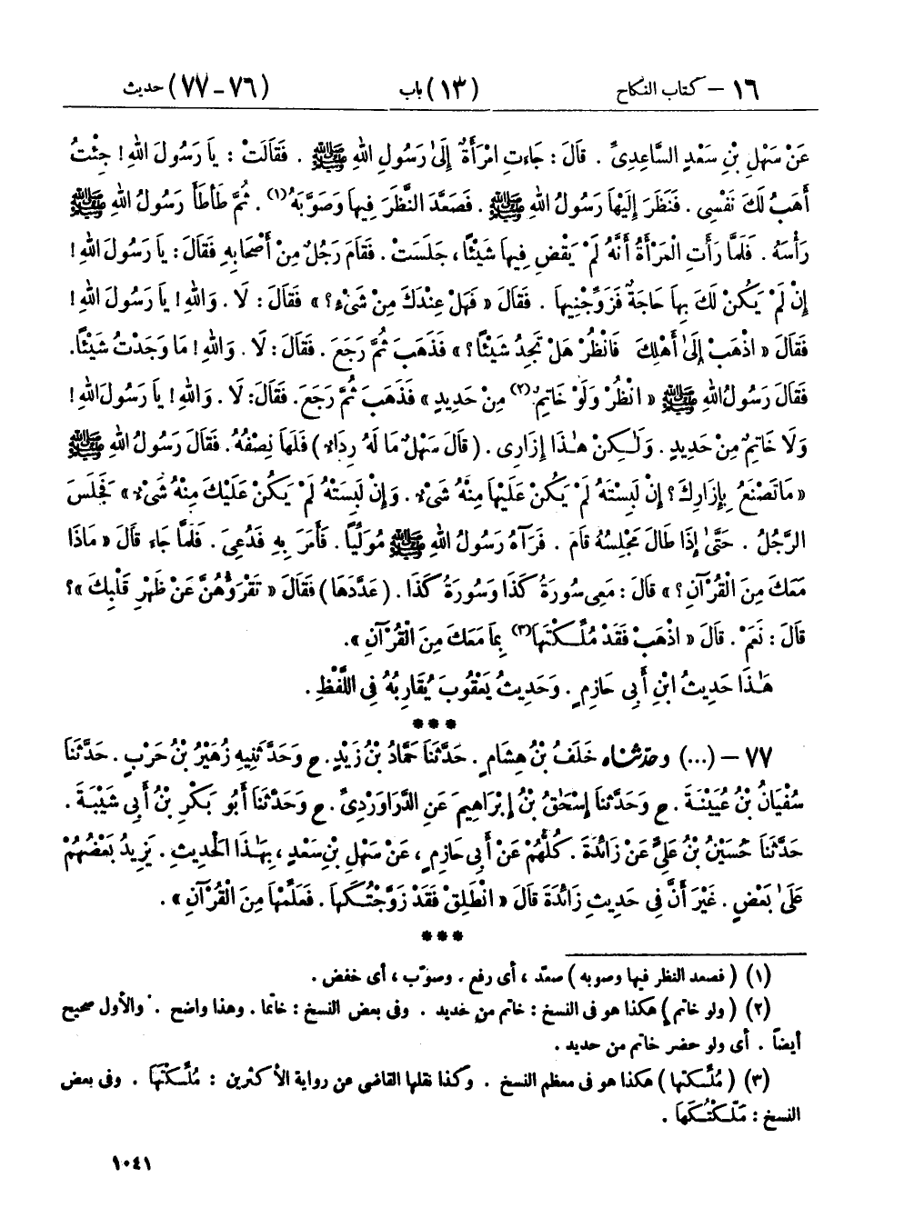 ٧٧ - (١٤٢٥) وَحَدَّثَنَاهُ خَلَفُ بْنُ هِشَامٍ، حَدَّثَنَا حَمَّادُ بْنُ زَيْدٍ، ح وحَدَّثَنِيهِ زُهَيْرُ بْنُ حَرْبٍ، حَدَّثَنَا سُفْيَانُ بْنُ عُيَيْنَةَ، ح وحَدَّثَنَا إِسْحَاقُ بْنُ إِبْرَاهِيمَ، عَنِ الدَّرَاوَرْدِيِّ، ح وحَدَّثَنَا أَبُو بَكْرِ بْنُ أَبِي شَيْبَةَ، حَدَّثَنَا حُسَيْنُ بْنُ عَلِيٍّ، عَنْ زَائِدَةَ، كُلُّهُمْ عَنْ أَبِي حَازِمٍ، عَنْ سَهْلِ بْنِ سَعْدٍ، بِهَذَا الْحَدِيثِ، يَزِيدُ بَعْضُهُمْ عَلَى بَعْضٍ، غَيْرَ أَنَّ فِي حَدِيثِ زَائِدَةَ، قَالَ: «انْطَلِقْ فَقَدْ زَوَّجْتُكَهَا فَعَلِّمْهَا مِنَ الْقُرْآنِ»