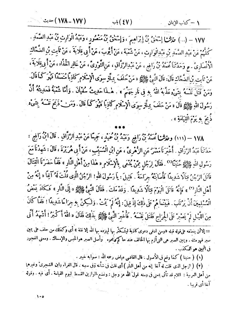 ١٧٧ - (١١٠) حَدَّثَنَا إِسْحَاقُ بْنُ إِبْرَاهِيمَ، وَإِسْحَاقُ بْنُ مَنْصُورٍ، وَعَبْدُ الْوَارِثِ بْنُ عَبْدِ الصَّمَدِ، كُلُّهُمْ عَنْ عَبْدِ الصَّمَدِ بْنِ عَبْدِ الْوَارِثِ، عَنْ شُعْبَةَ، عَنْ أَيُّوبَ، عَنْ أَبِي قِلَابَةَ، عَنْ ثَابِتِ بْنِ الضَّحَّاكِ الْأَنْصَارِيِّ ح، وَحَدَّثَنَا مُحَمَّدُ بْنُ رَافِعٍ، عَنْ عَبْدِ الرَّزَّاقِ، عَنِ الثَّوْرِيِّ، عَنْ خَالِدٍ الْحَذَّاءِ، عَنْ أَبِي قِلَابَةَ، عَنْ ثَابِتِ بْنِ الضَّحَّاكِ، قَالَ: قَالَ النَّبِيُّ صَلَّى اللهُ عَلَيْهِ وَسَلَّمَ: «مَنْ حَلَفَ بِمِلَّةٍ سِوَى الْإِسْلَامِ، كَاذِبًا مُتَعَمِّدًا، فَهْوَ كَمَا قَالَ، وَمَنْ قَتَلَ نَفْسَهُ بِشَيْءٍ، عَذَّبَهُ اللهُ بِهِ فِي نَارِ جَهَنَّمَ» هَذَا حَدِيثُ سُفْيَانَ، وَأَمَّا شُعْبَةُ فَحَدِيثُهُ: أَنَّ رَسُولَ اللهِ صَلَّى اللهُ عَلَيْهِ وَسَلَّمَ قَالَ: «مَنْ حَلَفَ بِمِلَّةٍ سِوَى الْإِسْلَامِ، كَاذِبًا، فَهْوَ كَمَا قَالَ، وَمَنْ ذَبَحَ نَفْسَهُ بِشَيْءٍ، ذُبِحَ بِهِ يَوْمَ الْقِيَامَةِ»