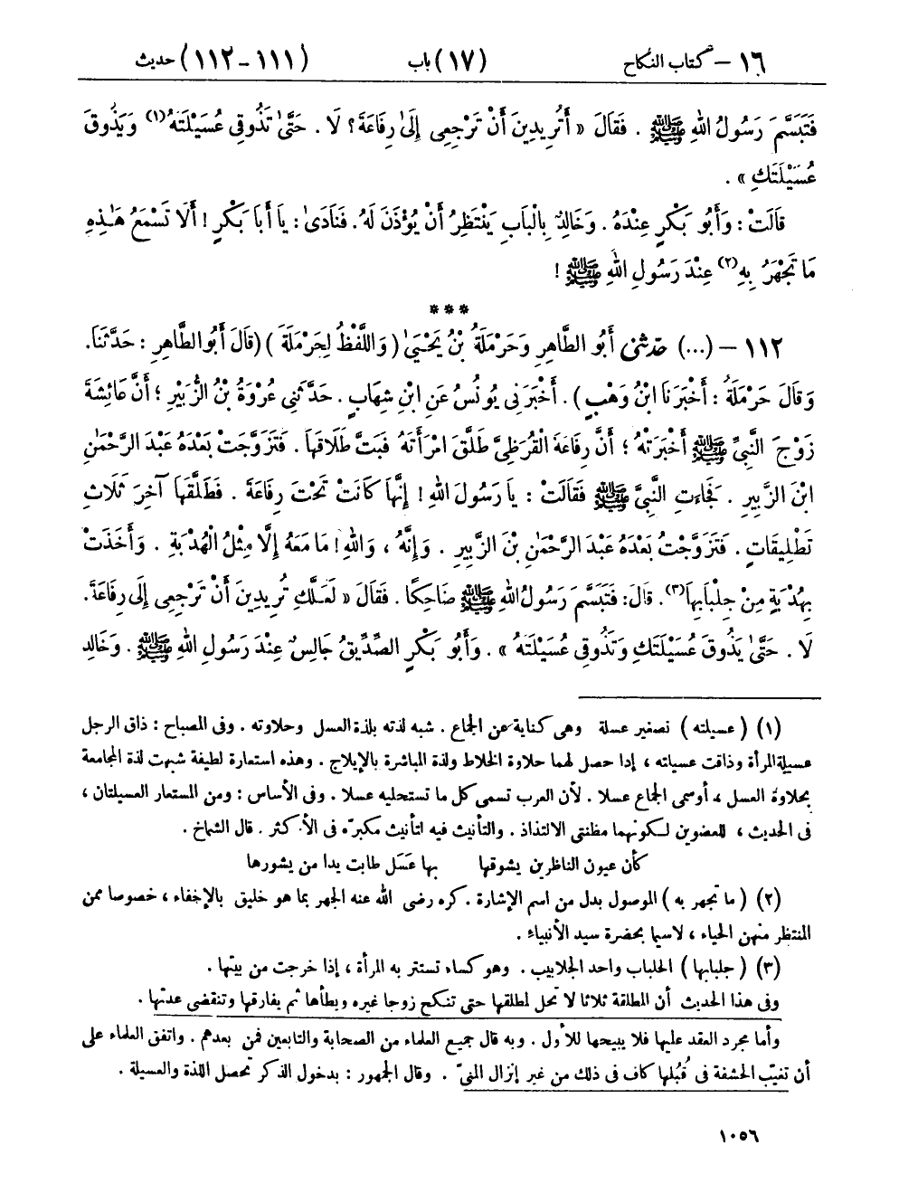 ١١٢ - (١٤٣٣) حَدَّثَنِي أَبُو الطَّاهِرِ، وَحَرْمَلَةُ بْنُ يَحْيَى، وَاللَّفْظُ لِحَرْمَلَةَ، قَالَ أَبُو الطَّاهِرِ: حَدَّثَنَا، وَقَالَ حَرْمَلَةُ: أَخْبَرَنَا ابْنُ وَهْبٍ، أَخْبَرَنِي يُونُسُ، عَنِ ابْنِ شِهَابٍ، حَدَّثَنِي عُرْوَةُ بْنُ الزُّبَيْرِ، أَنَّ عَائِشَةَ زَوْجَ النَّبِيِّ صَلَّى اللهُ عَلَيْهِ وَسَلَّمَ أَخْبَرَتْهُ، أَنَّ رِفَاعَةَ الْقُرَظِيَّ طَلَّقَ امْرَأَتَهُ، فَبَتَّ طَلَاقَهَا، فَتَزَوَّجَتْ بَعْدَهُ عَبْدَ الرَّحْمَنِ بْنَ الزَّبِيرِ، فَجَاءَتِ النَّبِيَّ صَلَّى اللهُ عَلَيْهِ وَسَلَّمَ فَقَالَتْ: يَا رَسُولَ اللهِ، إِنَّهَا كَانَتْ تَحْتَ رِفَاعَةَ، فَطَلَّقَهَا آخِرَ ثَلَاثِ تَطْلِيقَاتٍ، فَتَزَوَّجْتُ بَعْدَهُ عَبْدَ الرَّحْمَنِ بْنَ الزَّبِيرِ، وَإِنَّهُ وَاللهِ، مَا مَعَهُ إِلَّا مِثْلُ الْهُدْبَةِ، وَأَخَذَتْ بِهُدْبَةٍ مِنْ جِلْبَابِهَا، قَالَ: فَتَبَسَّمَ رَسُولُ اللهِ صَلَّى اللهُ عَلَيْهِ وَسَلَّمَ ضَاحِكًا، فَقَالَ: «لَعَلَّكِ تُرِيدِينَ أَنْ تَرْجِعِي إِلَى رِفَاعَةَ، لَا، حَتَّى يَذُوقَ عُسَيْلَتَكِ، وَتَذُوقِي عُسَيْلَتَهُ»، وَأَبُو بَكْرٍ الصِّدِّيقُ جَالِسٌ عِنْدَ رَسُولِ اللهِ صَلَّى اللهُ عَلَيْهِ وَسَلَّمَ، وَخَالِدُ بْنُ سَعِيدِ بْنِ الْعَاصِ جَالِسٌ بِبَابِ الْحُجْرَةِ، لَمْ يُؤْذَنْ لَهُ، قَالَ: فَطَفِقَ خَالِدٌ يُنَادِي أَبَا بَكْرٍ: أَلَا تَزْجُرُ هَذِهِ عَمَّا تَجْهَرُ بِهِ عِنْدَ رَسُولِ اللهِ صَلَّى اللهُ عَلَيْهِ وَسَلَّمَ.