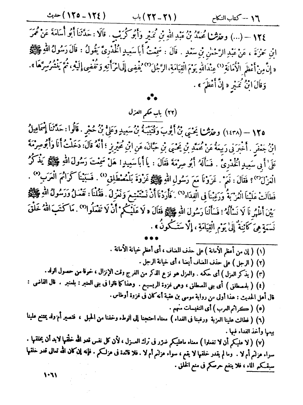 ١٢٥ - (١٤٣٨) وحَدَّثَنَا يَحْيَى بْنُ أَيُّوبَ، وَقُتَيْبَةُ بْنُ سَعِيدٍ، وَعَلِيُّ بْنُ حُجْرٍ، قَالُوا: حَدَّثَنَا إِسْمَاعِيلُ بْنُ جَعْفَرٍ، أَخْبَرَنِي رَبِيعَةُ، عَنْ مُحَمَّدِ بْنِ يَحْيَى بْنِ حَبَّانَ، عَنِ ابْنِ مُحَيْرِيزٍ، أَنَّهُ قَالَ: دَخَلْتُ أَنَا وَأَبُو صِرْمَةَ عَلَى أَبِي سَعِيدٍ الْخُدْرِيِّ، فَسَأَلَهُ أَبُو صِرْمَةَ، فَقَالَ: يَا أَبَا سَعِيدٍ، هَلْ سَمِعْتَ رَسُولَ اللهِ صَلَّى اللهُ عَلَيْهِ وَسَلَّمَ، يَذْكُرُ الْعَزْلَ؟ فَقَالَ: نَعَمْ، غَزَوْنَا مَعَ رَسُولِ اللهِ صَلَّى اللهُ عَلَيْهِ وَسَلَّمَ غَزْوَةَ بَلْمُصْطَلِقِ، فَسَبَيْنَا كَرَائِمَ الْعَرَبِ، فَطَالَتْ عَلَيْنَا الْعُزْبَةُ، وَرَغِبْنَا فِي الْفِدَاءِ، فَأَرَدْنَا أَنْ نَسْتَمْتِعَ وَنَعْزِلَ، فَقُلْنَا: نَفْعَلُ وَرَسُولُ اللهِ صَلَّى اللهُ عَلَيْهِ وَسَلَّمَ بَيْنَ أَظْهُرِنَا لَا نَسْأَلُهُ، فَسَأَلْنَا رَسُولَ اللهِ صَلَّى اللهُ عَلَيْهِ وَسَلَّمَ، فَقَالَ «لَا عَلَيْكُمْ أَنْ لَا تَفْعَلُوا، مَا كَتَبَ اللهُ خَلْقَ نَسَمَةٍ هِيَ كَائِنَةٌ إِلَى يَوْمِ الْقِيَامَةِ، إِلَّا سَتَكُونُ»،