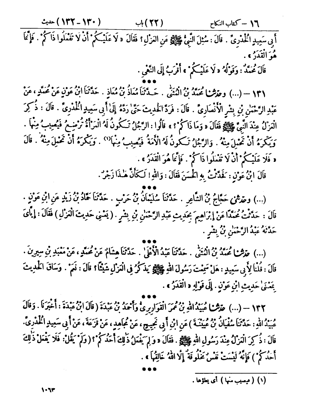 ١٣١ - (١٤٣٨) وحَدَّثَنَا مُحَمَّدُ بْنُ الْمُثَنَّى، حَدَّثَنَا مُعَاذُ بْنُ مُعَاذٍ، حَدَّثَنَا ابْنُ عَوْنٍ، عَنْ مُحَمَّدٍ، عَنْ عَبْدِ الرَّحْمَنِ بْنِ بِشْرٍ الْأَنْصَارِيِّ، قَالَ: فَرَدَّ الْحَدِيثَ حَتَّى رَدَّهُ إِلَى أَبِي سَعِيدٍ الْخُدْرِيِّ قَالَ: ذُكِرَ الْعَزْلُ عِنْدَ النَّبِيِّ صَلَّى اللهُ عَلَيْهِ وَسَلَّمَ، فَقَالَ: «وَمَا ذَاكُمْ؟» قَالُوا: الرَّجُلُ تَكُونُ لَهُ الْمَرْأَةُ تُرْضِعُ، فَيُصِيبُ مِنْهَا، وَيَكْرَهُ أَنْ تَحْمِلَ مِنْهُ، وَالرَّجُلُ تَكُونُ لَهُ الْأَمَةُ فَيُصِيبُ مِنْهَا، وَيَكْرَهُ أَنْ تَحْمِلَ مِنْهُ، قَالَ: «فَلَا عَلَيْكُمْ أَنْ لَا تَفْعَلُوا ذَاكُمْ، فَإِنَّمَا هُوَ الْقَدَرُ»، قَالَ ابْنُ عَوْنٍ: فَحَدَّثْتُ بِهِ الْحَسَنَ، فَقَالَ: وَاللهِ لَكَأَنَّ هَذَا زَجْرٌ.