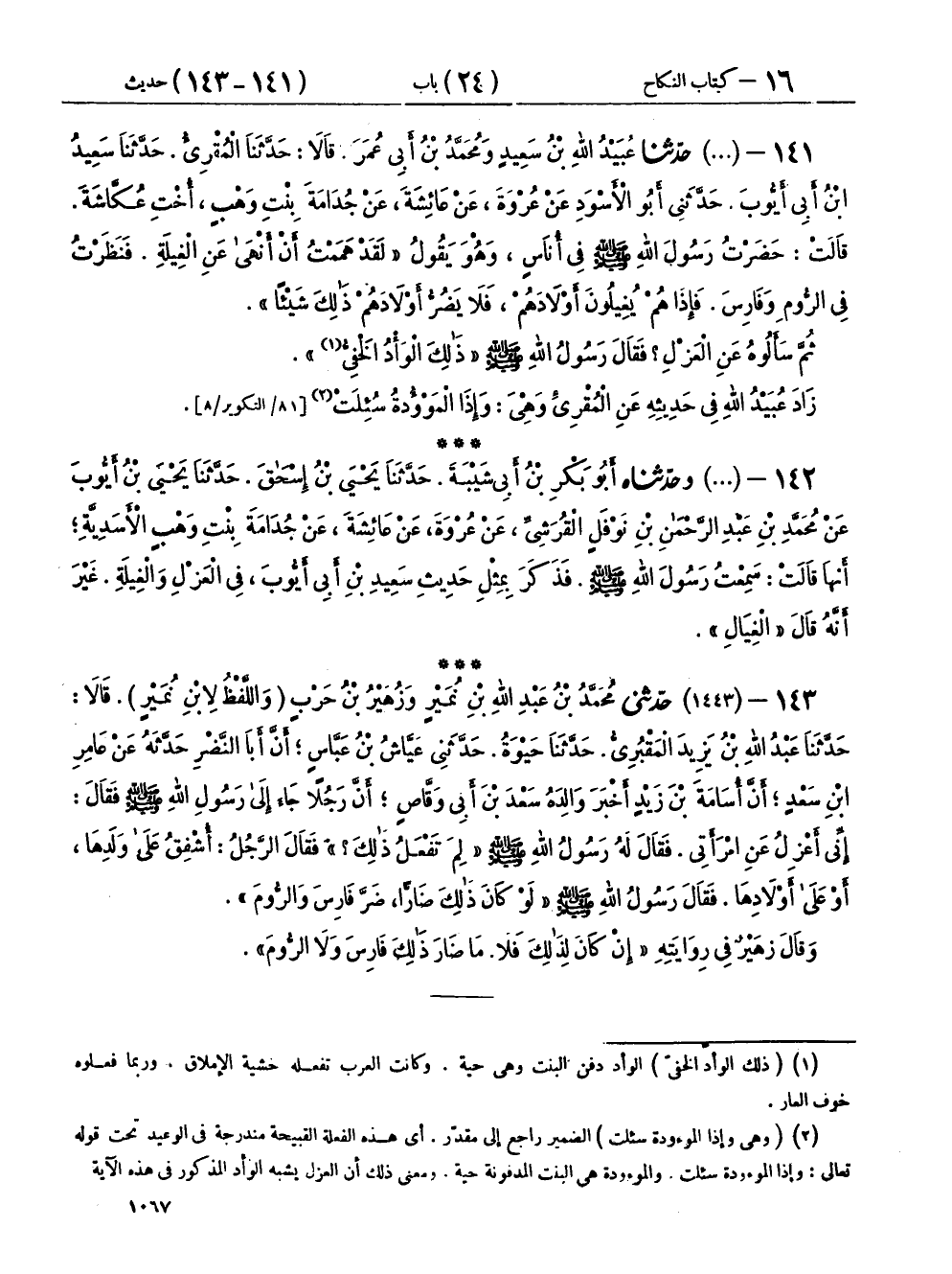١٤١ - (١٤٤٢) حَدَّثَنَا عُبَيْدُ اللهِ بْنُ سَعِيدٍ، وَمُحَمَّدُ بْنُ أَبِي عُمَرَ، قَالَا: حَدَّثَنَا الْمُقْرِئُ، حَدَّثَنَا سَعِيدُ بْنُ أَبِي أَيُّوبَ، حَدَّثَنِي أَبُو الْأَسْوَدِ، عَنْ عُرْوَةَ، عَنْ عَائِشَةَ، عَنْ جُدَامَةَ بِنْتِ وَهْبٍ، أُخْتِ عُكَّاشَةَ، قَالَتْ: حَضَرْتُ رَسُولَ اللهِ صَلَّى اللهُ عَلَيْهِ وَسَلَّمَ، فِي أُنَاسٍ وَهُوَ يَقُولُ: «لَقَدْ هَمَمْتُ أَنْ أَنْهَى عَنِ الْغِيلَةِ، فَنَظَرْتُ فِي الرُّومِ وَفَارِسَ، فَإِذَا هُمْ يُغِيلُونَ أَوْلَادَهُمْ، فَلَا يَضُرُّ أَوْلَادَهُمْ ذَلِكَ شَيْئًا»، ثُمَّ سَأَلُوهُ عَنِ الْعَزْلِ؟ فَقَالَ رَسُولُ اللهِ صَلَّى اللهُ عَلَيْهِ وَسَلَّمَ: «ذَلِكَ الْوَأْدُ الْخَفِيُّ»، زَادَ عُبَيْدُ اللهِ فِي حَدِيثِهِ: عَنِ الْمُقْرِئِ، وَهِيَ: {وَإِذَا الْمَوْءُودَةُ سُئِلَتْ}،
