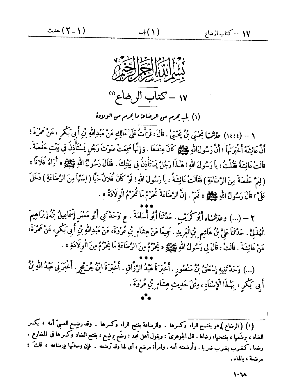 ١ - (١٤٤٤) حَدَّثَنَا يَحْيَى بْنُ يَحْيَى، قَالَ: قَرَأْتُ عَلَى مَالِكٍ، عَنْ عَبْدِ اللهِ بْنِ أَبِي بَكْرٍ، عَنْ عَمْرَةَ، أَنَّ عَائِشَةَ، أَخْبَرَتْهَا، أَنَّ رَسُولَ اللهِ صَلَّى اللهُ عَلَيْهِ وَسَلَّمَ كَانَ عِنْدَهَا، وَإِنَّهَا سَمِعَتْ صَوْتَ رَجُلٍ يَسْتَأْذِنُ فِي بَيْتِ حَفْصَةَ، قَالَتْ عَائِشَةُ: فَقُلْتُ: يَا رَسُولَ اللهِ، هَذَا رَجُلٌ يَسْتَأْذِنُ فِي بَيْتِكَ، فَقَالَ رَسُولُ اللهِ صَلَّى اللهُ عَلَيْهِ وَسَلَّمَ: «أُرَاهُ فُلَانًا» - لِعَمِّ حَفْصَةَ مِنَ الرَّضَاعَةِ - فَقَالَتْ عَائِشَةُ: يَا رَسُولَ اللهِ، لَوْ كَانَ فُلَانٌ حَيًّا - لِعَمِّهَا مِنَ الرَّضَاعَةِ - دَخَلَ عَلَيَّ؟ قَالَ رَسُولُ اللهِ صَلَّى اللهُ عَلَيْهِ وَسَلَّمَ: «نَعَمْ، إِنَّ الرَّضَاعَةَ تُحَرِّمُ مَا تُحَرِّمُ الْوِلَادَةُ»