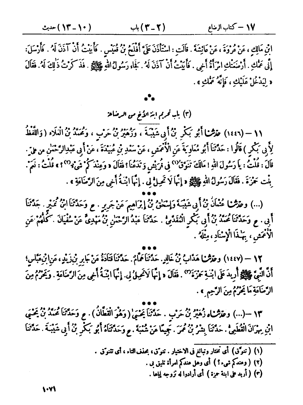 ١٣ - (١٤٤٧) وَحَدَّثَنَاهُ زُهَيْرُ بْنُ حَرْبٍ، حَدَّثَنَا يَحْيَى وَهُوَ الْقَطَّانُ، ح وحَدَّثَنَا مُحَمَّدُ بْنُ يَحْيَى بْنِ مِهْرَانَ الْقُطَعِيُّ، حَدَّثَنَا بِشْرُ بْنُ عُمَرَ، جَمِيعًا عَنْ شُعْبَةَ، ح وَحَدَّثَنَاهُ أَبُو بَكْرِ بْنُ أَبِي شَيْبَةَ، حَدَّثَنَا عَلِيُّ بْنُ مُسْهِرٍ، عَنْ سَعِيدِ بْنِ أَبِي عَرُوبَةَ، كِلَاهُمَا عَنْ قَتَادَةَ، بِإِسْنَادِ هَمَّامٍ سَوَاءً، غَيْرَ أَنَّ حَدِيثَ شُعْبَةَ، انْتَهَى عِنْدَ قَوْلِهِ: «ابْنَةُ أَخِي مِنَ الرَّضَاعَةِ»، وَفِي حَدِيثِ سَعِيدٍ ": وَإِنَّهُ يَحْرُمُ مِنَ الرَّضَاعَةِ مَا يَحْرُمُ مِنَ النَّسَبِ "، وَفِي رِوَايَةِ بِشْرِ بْنِ عُمَرَ: سَمِعْتُ جَابِرَ بْنَ زَيْدٍ