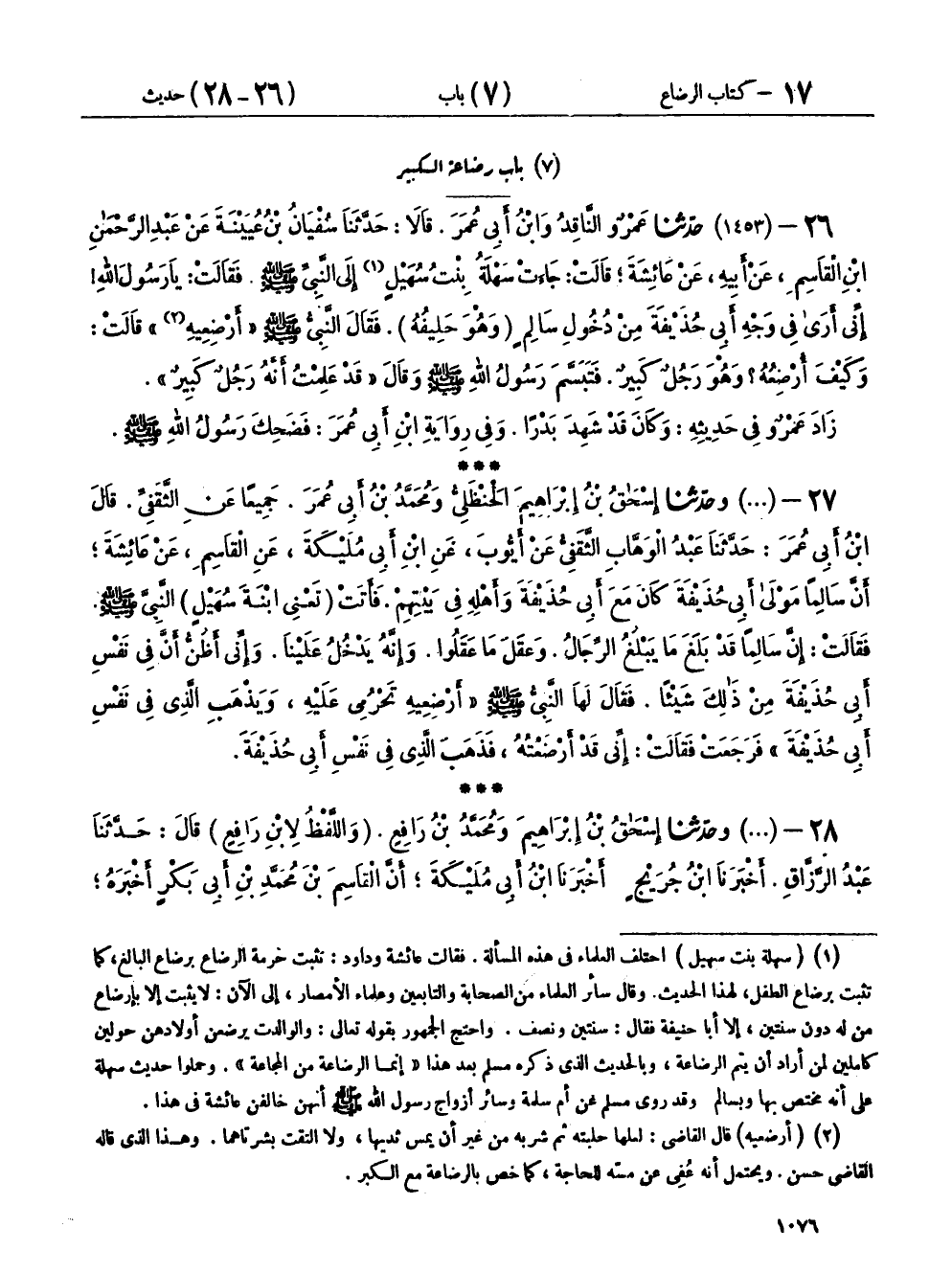 ٢٦ - (١٤٥٣) حَدَّثَنَا عَمْرٌو النَّاقِدُ، وَابْنُ أَبِي عُمَرَ، قَالَا: حَدَّثَنَا سُفْيَانُ بْنُ عُيَيْنَةَ، عَنْ عَبْدِ الرَّحْمَنِ بْنِ الْقَاسِمِ، عَنْ أَبِيهِ، عَنْ عَائِشَةَ، قَالَتْ: جَاءَتْ سَهْلَةُ بِنْتُ سُهَيْلٍ إِلَى النَّبِيِّ صَلَّى اللهُ عَلَيْهِ وَسَلَّمَ، فَقَالَتْ: يَا رَسُولَ اللهِ، إِنِّي أَرَى فِي وَجْهِ أَبِي حُذَيْفَةَ مِنْ دُخُولِ سَالِمٍ وَهُوَ حَلِيفُهُ، فَقَالَ النَّبِيُّ صَلَّى اللهُ عَلَيْهِ وَسَلَّمَ: «أَرْضِعِيهِ»، قَالَتْ: وَكَيْفَ أُرْضِعُهُ؟ وَهُوَ رَجُلٌ كَبِيرٌ، فَتَبَسَّمَ رَسُولُ اللهِ صَلَّى اللهُ عَلَيْهِ وَسَلَّمَ وَقَالَ: «قَدْ عَلِمْتُ أَنَّهُ رَجُلٌ كَبِيرٌ»، زَادَ عَمْرٌو فِي حَدِيثِهِ: وَكَانَ قَدْ شَهِدَ بَدْرًا، وَفِي رِوَايَةِ ابْنِ أَبِي عُمَرَ: فَضَحِكَ رَسُولُ اللهِ صَلَّى اللهُ عَلَيْهِ وَسَلَّمَ