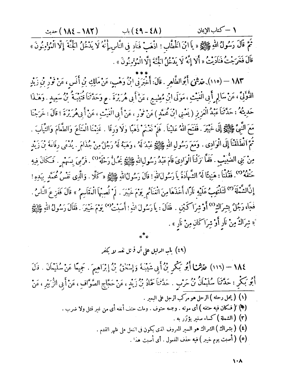 ١٨٣ - (١١٥) حَدَّثَنِي أَبُو الطَّاهِرِ، قَالَ: أَخْبَرَنِي ابْنُ وَهْبٍ، عَنْ مَالِكِ بْنِ أَنَسٍ، عَنْ ثَوْرِ بْنِ زَيْدٍ الدُّؤَلِيِّ، عَنْ سَالِمٍ أَبِي الْغَيْثِ، مَوْلَى ابْنِ مُطِيعٍ، عَنْ أَبِي هُرَيْرَةَ، ح وَحَدَّثَنَا قُتَيْبَةُ بْنُ سَعِيدٍ، وَهَذَا حَدِيثُهُ: حَدَّثَنَا عَبْدُ الْعَزِيزِ يَعْنِي ابْنَ مُحَمَّدٍ، عَنْ ثَوْرٍ، عَنْ أَبِي الْغَيْثِ، عَنْ أَبِي هُرَيْرَةَ، قَالَ: خَرَجْنَا مَعَ النَّبِيِّ صَلَّى اللهُ عَلَيْهِ وَسَلَّمَ إِلَى خَيْبَرَ، فَفَتَحَ اللهُ عَلَيْنَا فَلَمْ نَغْنَمْ ذَهَبًا وَلَا وَرِقًا، غَنِمْنَا الْمَتَاعَ وَالطَّعَامَ وَالثِّيَابَ، ثُمَّ انْطَلَقْنَا إِلَى الْوَادِي، وَمَعَ رَسُولِ اللهِ صَلَّى اللهُ عَلَيْهِ وَسَلَّمَ عَبْدٌ لَهُ، وَهَبَهُ لَهُ رَجُلٌ مِنْ جُذَامٍ يُدْعَى رِفَاعَةَ بْنَ زَيْدٍ مِنْ بَنِي الضُّبَيْبِ، فَلَمَّا نَزَلْنَا الْوَادِيَ، قَامَ عَبْدُ رَسُولِ اللهِ صَلَّى اللهُ عَلَيْهِ وَسَلَّمَ يَحُلُّ رَحْلَهُ، فَرُمِيَ بِسَهْمٍ، فَكَانَ فِيهِ حَتْفُهُ، فَقُلْنَا: هَنِيئًا لَهُ الشَّهَادَةُ يَا رَسُولَ اللهِ، قَالَ رَسُولُ اللهِ صَلَّى اللهُ عَلَيْهِ وَسَلَّمَ: «كَلَّا وَالَّذِي نَفْسُ مُحَمَّدٍ بِيَدِهِ، إِنَّ الشِّمْلَةَ لَتَلْتَهِبُ عَلَيْهِ نَارًا أَخَذَهَا مِنَ الْغَنَائِمِ يَوْمَ خَيْبَرَ لَمْ تُصِبْهَا الْمَقَاسِمُ»، قَالَ: فَفَزِعَ النَّاسُ، فَجَاءَ رَجُلٌ بِشِرَاكٍ أَوْ شِرَاكَيْنِ فَقَالَ: يَا رَسُولَ اللهِ، أَصَبْتُ يَوْمَ خَيْبَرَ، فَقَالَ رَسُولُ اللهِ صَلَّى اللهُ عَلَيْهِ وَسَلَّمَ: «شِرَاكٌ مِنْ نَارٍ أَوْ شِرَاكَانِ مِنْ نَارٍ»