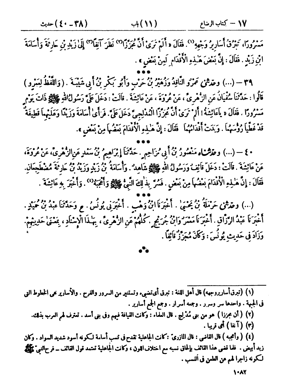 ٣٩ - (١٤٥٩) وحَدَّثَنِي عَمْرٌو النَّاقِدُ، وَزُهَيْرُ بْنُ حَرْبٍ، وَأَبُو بَكْرِ بْنُ أَبِي شَيْبَةَ، وَاللَّفْظُ لِعَمْرٍو، قَالُوا: حَدَّثَنَا سُفْيَانُ، عَنِ الزُّهْرِيِّ، عَنْ عُرْوَةَ، عَنْ عَائِشَةَ، قَالَتْ: دَخَلَ عَلَيَّ رَسُولُ اللهِ صَلَّى اللهُ عَلَيْهِ وَسَلَّمَ ذَاتَ يَوْمٍ مَسْرُورًا، فَقَالَ: " يَا عَائِشَةُ، أَلَمْ تَرَيْ أَنَّ مُجَزِّزًا الْمُدْلِجِيَّ دَخَلَ عَلَيَّ، فَرَأَى أُسَامَةَ وَزَيْدًا، وَعَلَيْهِمَا قَطِيفَةٌ قَدْ غَطَّيَا رُءُوسَهُمَا، وَبَدَتْ أَقْدَامُهُمَا، فَقَالَ: إِنَّ هَذِهِ الْأَقْدَامَ بَعْضُهَا مِنْ بَعْضٍ "