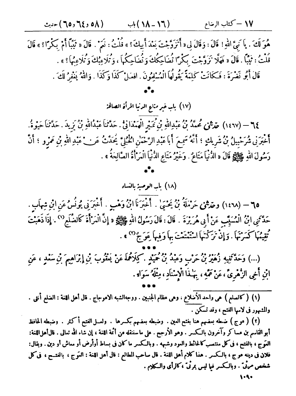 ٦٥ - (١٤٦٨) وحَدَّثَنِي حَرْمَلَةُ بْنُ يَحْيَى، أَخْبَرَنَا ابْنُ وَهْبٍ، أَخْبَرَنِي يُونُسُ، عَنِ ابْنِ شِهَابٍ، حَدَّثَنِي ابْنُ الْمُسَيِّبِ، عَنْ أَبِي هُرَيْرَةَ، قَالَ: قَالَ رَسُولُ اللهِ صَلَّى اللهُ عَلَيْهِ وَسَلَّمَ: «إِنَّ الْمَرْأَةَ كَالضِّلَعِ، إِذَا ذَهَبْتَ تُقِيمُهَا كَسَرْتَهَا، وَإِنْ تَرَكْتَهَا اسْتَمْتَعْتَ بِهَا وَفِيهَا عِوَجٌ»،