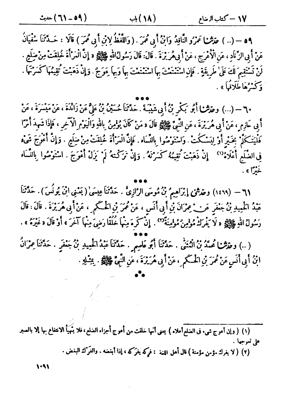 ٥٩ - (١٤٦٨) حَدَّثَنَا عَمْرٌو النَّاقِدُ، وَابْنُ أَبِي عُمَرَ، وَاللَّفْظُ لِابْنِ أَبِي عُمَرَ، قَالَا: حَدَّثَنَا سُفْيَانُ، عَنْ أَبِي الزِّنَادِ، عَنِ الْأَعْرَجِ، عَنْ أَبِي هُرَيْرَةَ، قَالَ: قَالَ رَسُولُ اللهِ صَلَّى اللهُ عَلَيْهِ وَسَلَّمَ: «إِنَّ الْمَرْأَةَ خُلِقَتْ مِنْ ضِلَعٍ لَنْ تَسْتَقِيمَ لَكَ عَلَى طَرِيقَةٍ، فَإِنِ اسْتَمْتَعْتَ بِهَا اسْتَمْتَعْتَ بِهَا وَبِهَا عِوَجٌ، وَإِنْ ذَهَبْتَ تُقِيمُهَا، كَسَرْتَهَا وَكَسْرُهَا طَلَاقُهَا»