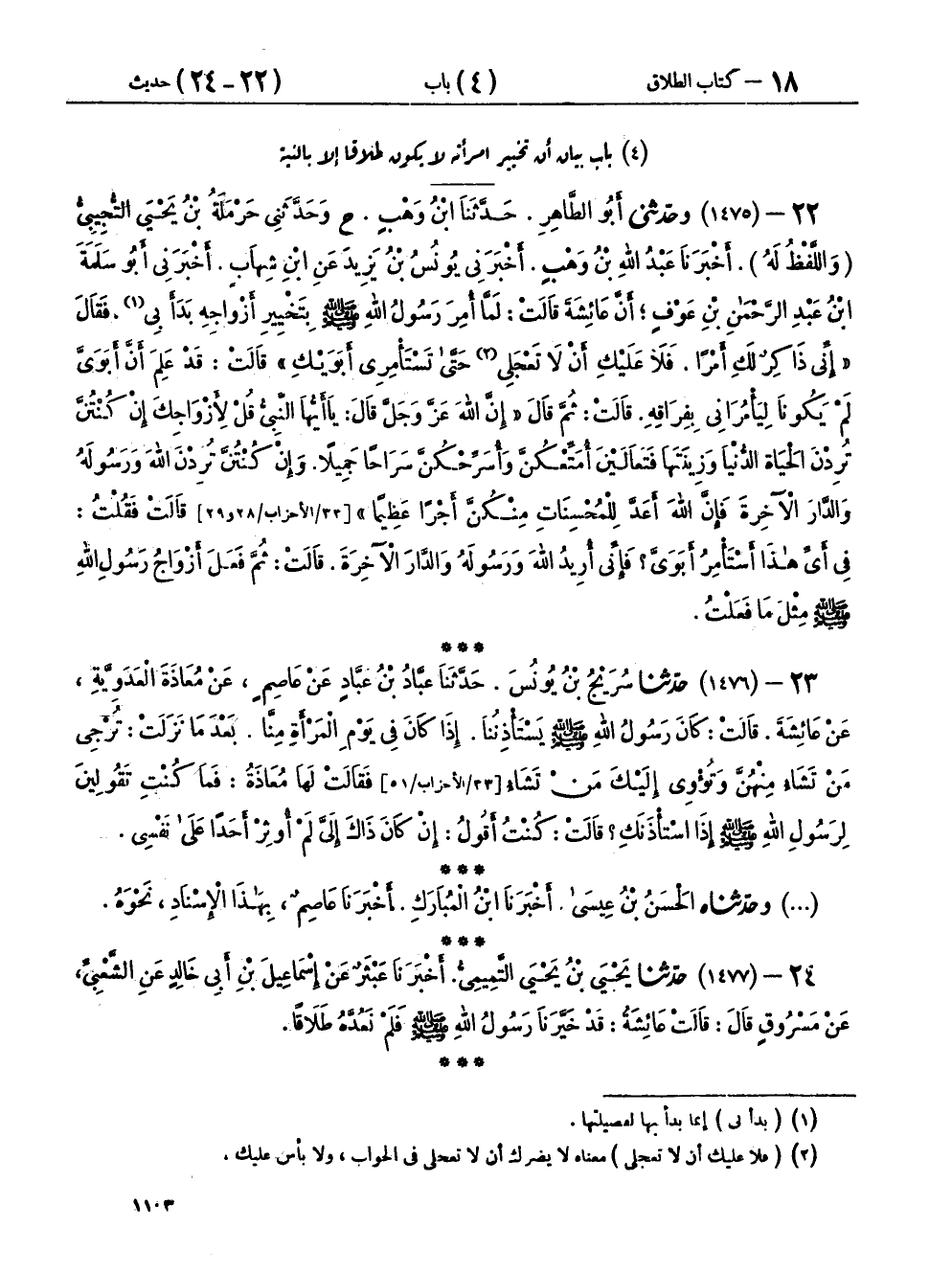 ٢٢ - (١٤٧٥) وحَدَّثَنِي أَبُو الطَّاهِرِ، حَدَّثَنَا ابْنُ وَهْبٍ، ح وحَدَّثَنِي حَرْمَلَةُ بْنُ يَحْيَى التُّجِيبِيُّ، وَاللَّفْظُ لَهُ، أَخْبَرَنَا عَبْدُ اللهِ بْنُ وَهْبٍ، أَخْبَرَنِي يُونُسُ بْنُ يَزِيدَ، عَنِ ابْنِ شِهَابٍ، أَخْبَرَنِي أَبُو سَلَمَةَ بْنُ عَبْدِ الرَّحْمَنِ بْنِ عَوْفٍ، أَنَّ عَائِشَةَ، قَالَتْ: لَمَّا أُمِرَ رَسُولُ اللهِ صَلَّى اللهُ عَلَيْهِ وَسَلَّمَ بِتَخْيِيرِ أَزْوَاجِهِ، بَدَأَ بِي، فَقَالَ: «إِنِّي ذَاكِرٌ لَكِ أَمْرًا، فَلَا عَلَيْكِ أَنْ لَا تَعْجَلِي حَتَّى تَسْتَأْمِرِي أَبَوَيْكِ»، قَالَتْ: قَدْ عَلِمَ أَنَّ أَبَوَيَّ لَمْ يَكُونَا لِيَأْمُرَانِي بِفِرَاقِهِ، قَالَتْ: ثُمَّ قَالَ: " إِنَّ اللهَ عَزَّ وَجَلَّ قَالَ: {يَا أَيُّهَا النَّبِيُّ قُلْ لِأَزْوَاجِكَ إِنْ كُنْتُنَّ تُرِدْنَ الْحَيَاةَ الدُّنْيَا وَزِينَتَهَا فَتَعَالَيْنَ أُمَتِّعْكُنَّ وَأُسَرِّحْكُنَّ سَرَاحًا جَمِيلًا وَإِنْ كُنْتُنَّ تُرِدْنَ اللهَ وَرَسُولَهُ وَالدَّارَ الْآخِرَةَ فَإِنَّ اللهَ أَعَدَّ لِلْمُحْسِنَاتِ مِنْكُنَّ أَجْرًا عَظِيمًا} [الأحزاب: ٢٩] "، قَالَتْ: فَقُلْتُ: فِي أَيِّ هَذَا أَسْتَأْمِرُ أَبَوَيَّ؟ فَإِنِّي أُرِيدُ اللهَ وَرَسُولَهُ وَالدَّارَ الْآخِرَةَ، قَالَتْ: ثُمَّ فَعَلَ أَزْوَاجُ رَسُولِ اللهِ صَلَّى اللهُ عَلَيْهِ وَسَلَّمَ مِثْلَ مَا فَعَلْتُ