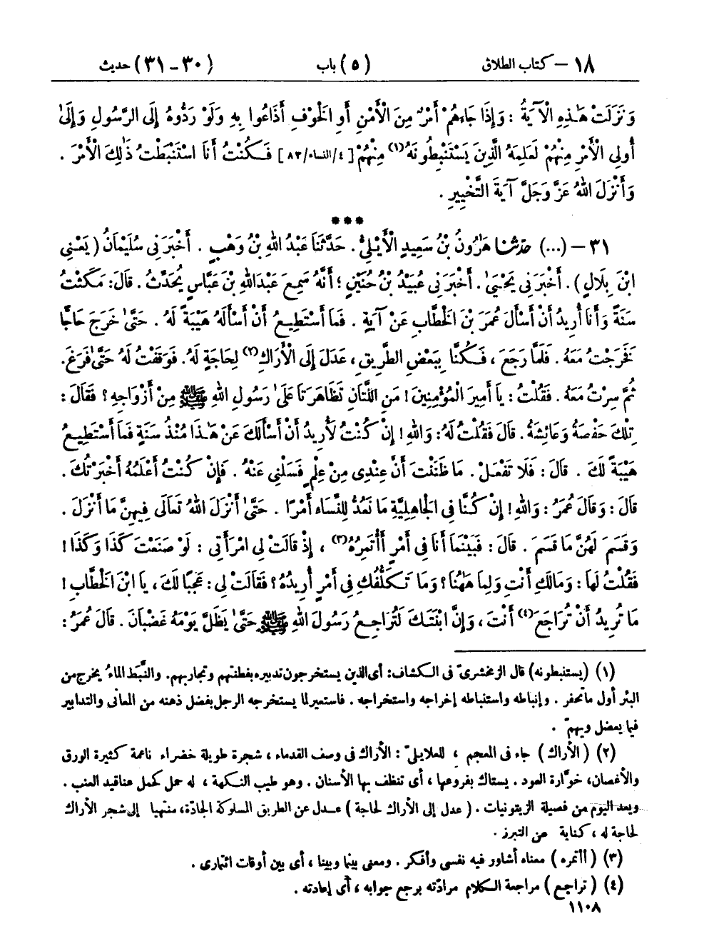 ٣١ - (١٤٧٩) حَدَّثَنَا هَارُونُ بْنُ سَعِيدٍ الْأَيْلِيُّ، حَدَّثَنَا عَبْدُ اللهِ بْنُ وَهْبٍ، أَخْبَرَنِي سُلَيْمَانُ يَعْنِي ابْنَ بِلَالٍ، أَخْبَرَنِي يَحْيَى، أَخْبَرَنِي عُبَيْدُ بْنُ حُنَيْنٍ، أَنَّهُ سَمِعَ عَبْدَ اللهِ بْنَ عَبَّاسٍ، يُحَدِّثُ قَالَ: مَكَثْتُ سَنَةً وَأَنَا أُرِيدُ أَنْ أَسْأَلَ عُمَرَ بْنَ الْخَطَّابِ عَنْ آيَةٍ، فَمَا أَسْتَطِيعُ أَنْ أَسْأَلَهُ، هَيْبَةً لَهُ حَتَّى خَرَجَ حَاجًّا، فَخَرَجْتُ مَعَهُ، فَلَمَّا رَجَعَ فَكُنَّا بِبَعْضِ الطَّرِيقِ عَدَلَ إِلَى الْأَرَاكِ لِحَاجَةٍ لَهُ، فَوَقَفْتُ لَهُ حَتَّى فَرَغَ، ثُمَّ سِرْتُ مَعَهُ، فَقُلْتُ: يَا أَمِيرَ الْمُؤْمِنِينَ، مَنِ اللَّتَانِ تَظَاهَرَتَا عَلَى رَسُولِ اللهِ صَلَّى اللهُ عَلَيْهِ وَسَلَّمَ مِنْ أَزْوَاجِهِ، فَقَالَ: تِلْكَ حَفْصَةُ وَعَائِشَةُ، قَالَ فَقُلْتُ لَهُ: وَاللهِ، إِنْ كُنْتُ لَأُرِيدُ أَنْ أَسْأَلَكَ عَنْ هَذَا مُنْذُ سَنَةٍ، فَمَا أَسْتَطِيعُ هَيْبَةً لَكَ، قَالَ: فَلَا تَفْعَلْ، مَا ظَنَنْتَ أَنَّ عِنْدِي مِنْ عِلْمٍ فَسَلْنِي عَنْهُ، فَإِنْ كُنْتُ أَعْلَمُهُ أَخْبَرْتُكَ، قَالَ: وَقَالَ عُمَرُ: وَاللهِ، إِنْ كُنَّا فِي الْجَاهِلِيَّةِ مَا نَعُدُّ لِلنِّسَاءِ أَمْرًا، حَتَّى أَنْزَلَ اللهُ تَعَالَى فِيهِنَّ مَا أَنْزَلَ، وَقَسَمَ لَهُنَّ مَا قَسَمَ، قَالَ: فَبَيْنَمَا أَنَا فِي أَمْرٍ أَأْتَمِرُهُ إِذْ قَالَتْ لِي امْرَأَتِي: لَوْ صَنَعْتَ كَذَا وَكَذَا، فَقُلْتُ لَهَا: وَمَا لَكِ أَنْتِ، وَلِمَا هَاهُنَا؟ وَمَا تَكَلُّفُكِ فِي أَمْرٍ أُرِيدُهُ، فَقَالَتْ لِي: عَجَبًا لَكَ يَا ابْنَ الْخَطَّابِ، مَا تُرِيدُ أَنْ تُرَاجَعَ أَنْتَ، وَإِنَّ ابْنَتَكَ لَتُرَاجِعُ رَسُولَ اللهِ صَلَّى اللهُ عَلَيْهِ وَسَلَّمَ، حَتَّى يَظَلَّ يَوْمَهُ غَضْبَانَ، قَالَ عُمَرُ ⦗١١٠٩⦘: فَآخُذُ رِدَائِي، ثُمَّ أَخْرُجُ مَكَانِي حَتَّى أَدْخُلَ عَلَى حَفْصَةَ، فَقُلْتُ لَهَا: يَا بُنَيَّةُ إِنَّكِ لَتُرَاجِعِينَ رَسُولَ اللهِ صَلَّى اللهُ عَلَيْهِ وَسَلَّمَ، حَتَّى يَظَلَّ يَوْمَهُ غَضْبَانَ؟ فَقَالَتْ حَفْصَةُ: وَاللهِ إِنَّا لَنُرَاجِعُهُ، فَقُلْتُ: تَعْلَمِينَ أَنِّي أُحَذِّرُكِ عُقُوبَةَ اللهِ، وَغَضَبَ رَسُولِهِ، يَا بُنَيَّةُ، لَا يَغُرَّنَّكِ هَذِهِ الَّتِي قَدْ أَعْجَبَهَا حُسْنُهَا، وَحُبُّ رَسُولِ اللهِ صَلَّى اللهُ عَلَيْهِ وَسَلَّمَ إِيَّاهَا، ثُمَّ خَرَجْتُ حَتَّى أَدْخُلَ عَلَى أُمِّ سَلَمَةَ لِقَرَابَتِي مِنْهَا، فَكَلَّمْتُهَا، فَقَالَتْ لِي أُمُّ سَلَمَةَ: عَجَبًا لَكَ يَا ابْنَ الْخَطَّابِ قَدْ دَخَلْتَ فِي كُلِّ شَيْءٍ، حَتَّى تَبْتَغِيَ أَنْ تَدْخُلَ بَيْنَ رَسُولِ اللهِ صَلَّى اللهُ عَلَيْهِ وَسَلَّمَ وَأَزْوَاجِهِ، قَالَ: فَأَخَذَتْنِي أَخْذًا كَسَرَتْنِي عَنْ بَعْضِ مَا كُنْتُ أَجِدُ، فَخَرَجْتُ مِنْ عِنْدِهَا، وَكَانَ لِي صَاحِبٌ مِنَ الْأَنْصَارِ إِذَا غِبْتُ أَتَانِي بِالْخَبَرِ، وَإِذَا غَابَ كُنْتُ أَنَا آتِيهِ بِالْخَبَرِ، وَنَحْنُ حِينَئِذٍ نَتَخَوَّفُ مَلِكًا مِنْ مُلُوكِ غَسَّانَ، ذُكِرَ لَنَا أَنَّهُ يُرِيدُ أَنْ يَسِيرَ إِلَيْنَا، فَقَدِ امْتَلَأَتْ صُدُورُنَا مِنْهُ، فَأَتَى صَاحِبِي الْأَنْصَارِيُّ يَدُقُّ الْبَابَ، وَقَالَ: افْتَحِ افْتَحْ، فَقُلْتُ: جَاءَ الْغَسَّانِيُّ؟ فَقَالَ: أَشَدُّ مِنْ ذَلِكَ، اعْتَزَلَ رَسُولُ اللهِ صَلَّى اللهُ عَلَيْهِ وَسَلَّمَ أَزْوَاجَهُ، فَقُلْتُ: رَغِمَ أَنْفُ حَفْصَةَ وَعَائِشَةَ، ثُمَّ آخُذُ ثَوْبِي، فَأَخْرُجُ حَتَّى جِئْتُ، فَإِذَا رَسُولُ اللهِ صَلَّى اللهُ عَلَيْهِ وَسَلَّمَ فِي مَشْرُبَةٍ لَهُ يُرْتَقَى إِلَيْهَا بِعَجَلَةٍ، وَغُلَامٌ لِرَسُولِ اللهِ صَلَّى اللهُ عَلَيْهِ وَسَلَّمَ أَسْوَدُ عَلَى ر