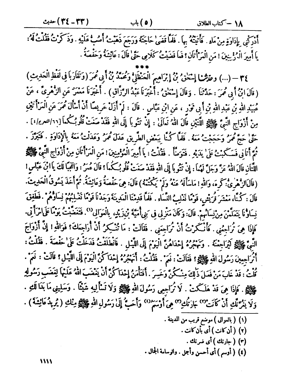 ٣٤ - (١٤٧٩) وحَدَّثَنَا إِسْحَاقُ بْنُ إِبْرَاهِيمَ الْحَنْظَلِيُّ، وَمُحَمَّدُ بْنُ أَبِي عُمَرَ، وَتَقَارَبَا فِي لَفْظِ الْحَدِيثِ، قَالَ ابْنُ أَبِي عُمَرَ: حَدَّثَنَا، وقَالَ إِسْحَاقُ: أَخْبَرَنَا عَبْدُ الرَّزَّاقِ، أَخْبَرَنَا مَعْمَرٌ، عَنِ الزُّهْرِيِّ، عَنْ عُبَيْدِ اللهِ بْنِ عَبْدِ اللهِ بْنِ أَبِي ثَوْرٍ، عَنِ ابْنِ عَبَّاسٍ، قَالَ: لَمْ أَزَلْ حَرِيصًا أَنْ أَسْأَلَ عُمَرَ عَنِ الْمَرْأَتَيْنِ مِنْ أَزْوَاجِ النَّبِيِّ صَلَّى اللهُ عَلَيْهِ وَسَلَّمَ اللَّتَيْنِ قَالَ اللهُ تَعَالَى: {إِنْ تَتُوبَا إِلَى اللهِ فَقَدْ صَغَتْ قُلُوبُكُمَا} [التحريم: ٤]؟ حَتَّى حَجَّ عُمَرُ وَحَجَجْتُ مَعَهُ، فَلَمَّا كُنَّا بِبَعْضِ الطَّرِيقِ، عَدَلَ عُمَرُ، وَعَدَلْتُ مَعَهُ بِالْإِدَاوَةِ، فَتَبَرَّزَ، ثُمَّ أَتَانِي، فَسَكَبْتُ عَلَى يَدَيْهِ، فَتَوَضَّأَ، فَقُلْتُ: يَا أَمِيرَ الْمُؤْمِنِينَ، مَنِ الْمَرْأَتَانِ مِنْ أَزْوَاجِ النَّبِيِّ صَلَّى اللهُ عَلَيْهِ وَسَلَّمَ اللَّتَانِ قَالَ اللهُ عَزَّ وَجَلَّ لَهُمَا: {إِنْ تَتُوبَا إِلَى اللهِ فَقَدْ صَغَتْ قُلُوبُكُمَا} [التحريم: ٤]؟ قَالَ عُمَرُ: وَاعَجَبًا لَكَ يَا ابْنَ عَبَّاسٍ - قَالَ الزُّهْرِيُّ: كَرِهَ وَاللهِ مَا سَأَلَهُ عَنْهُ، وَلَمْ يَكْتُمْهُ - قَالَ: «هِيَ حَفْصَةُ وَعَائِشَةُ»، ثُمَّ أَخَذَ يَسُوقُ الْحَدِيثَ، قَالَ: كُنَّا مَعْشَرَ قُرَيْشٍ قَوْمًا نَغْلِبُ النِّسَاءَ، فَلَمَّا قَدِمْنَا الْمَدِينَةَ، وَجَدْنَا قَوْمًا تَغْلِبُهُمْ نِسَاؤُهُمْ، فَطَفِقَ نِسَاؤُنَا يَتَعَلَّمْنَ مِنْ نِسَائِهِمْ، قَالَ: وَكَانَ مَنْزِلِي فِي بَنِي أُمَيَّةَ بْنِ زَيْدٍ بِالْعَوَالِي، فَتَغَضَّبْتُ يَوْمًا عَلَى امْرَأَتِي، فَإِذَا هِيَ تُرَاجِعُنِي، فَأَنْكَرْتُ أَنْ تُرَاجِعَنِي، فَقَالَتْ: مَا تُنْكِرُ أَنْ أُرَاجِعَكَ، فَوَاللهِ إِنَّ أَزْوَاجَ النَّبِيِّ صَلَّى اللهُ عَلَيْهِ وَسَلَّمَ لَيُرَاجِعْنَهُ، وَتَهْجُرُهُ إِحْدَاهُنَّ الْيَوْمَ إِلَى اللَّيْلِ، فَانْطَلَقْتُ فَدَخَلْتُ عَلَى حَفْصَةَ، فَقُلْتُ: أَتُرَاجِعِينَ رَسُولَ اللهِ صَلَّى اللهُ عَلَيْهِ وَسَلَّمَ؟ فَقَالَتْ: نَعَمْ، فَقُلْتُ: أَتَهْجُرُهُ إِحْدَاكُنَّ الْيَوْمَ إِلَى اللَّيْلِ؟ قَالَتْ: نَعَمْ، قُلْتُ: قَدْ خَابَ مَنْ فَعَلَ ذَلِكَ مِنْكُنَّ، وَخَسِرَ، أَفَتَأْمَنُ إِحْدَاكُنَّ أَنْ يَغْضَبَ اللهُ عَلَيْهَا لِغَضَبِ رَسُولِهِ صَلَّى اللهُ عَلَيْهِ وَسَلَّمَ؟ فَإِذَا هِيَ قَدْ هَلَكَتْ، لَا تُرَاجِعِي رَسُولَ اللهِ صَلَّى اللهُ عَلَيْهِ وَسَلَّمَ، وَلَا تَسْأَلِيهِ شَيْئًا، وَسَلِينِي مَا بَدَا لَكِ، وَلَا يَغُرَّنَّكِ أَنْ كَانَتْ جَارَتُكِ هِيَ أَوْسَمَ وَأَحَبَّ إِلَى رَسُولِ اللهِ صَلَّى اللهُ عَلَيْهِ وَسَلَّمَ مِنْكِ - يُرِيدُ عَائِشَةَ ⦗١١١٢⦘ قَالَ: وَكَانَ لِي جَارٌ مِنَ الْأَنْصَارِ، فَكُنَّا نَتَنَاوَبُ النُّزُولَ إِلَى رَسُولِ اللهِ صَلَّى اللهُ عَلَيْهِ وَسَلَّمَ، فَيَنْزِلُ يَوْمًا وَأَنْزِلُ يَوْمًا، فَيَأْتِينِي بِخَبَرِ الْوَحْيِ وَغَيْرِهِ، وَآتِيهِ بِمِثْلِ ذَلِكَ. وَكُنَّا نَتَحَدَّثُ أَنَّ غَسَّانَ تُنْعِلُ الْخَيْلَ لِتَغْزُوَنَا، فَنَزَلَ صَاحِبِي، ثُمَّ أَتَانِي عِشَاءً، فَضَرَبَ بَابِي، ثُمَّ نَادَانِي، فَخَرَجْتُ إِلَيْهِ، فَقَالَ: حَدَثَ أَمْرٌ عَظِيمٌ، قُلْتُ: مَاذَا؟ أَجَاءَتْ غَسَّانُ؟ قَالَ: لَا، بَلْ أَعْظَمُ مِنْ ذَلِكَ وَأَطْوَلُ، طَلَّقَ النَّبِيُّ صَلَّى اللهُ عَلَيْهِ وَسَلَّمَ نِسَاءَهُ، فَقُلْتُ: قَدْ خَابَتْ حَفْصَةُ وَخَسِرَتْ، قَدْ كُنْتُ أَظُنُّ هَذَا كَائِنًا، حَتَّى إِذَا صَلَّيْتُ الصُّبْحَ شَدَدْتُ عَلَيَّ ثِيَابِي، ثُمَّ نَزَلْتُ فَدَخَلْتُ عَلَى حَفْصَةَ وَهِيَ تَبْكِي، فَقُلْتُ: أَط