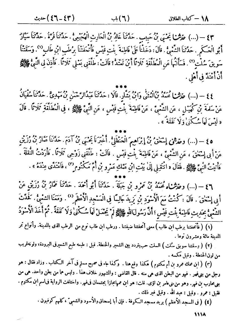٤٦ - (١٤٨٠) وَحَدَّثَنَاهُ مُحَمَّدُ بْنُ عَمْرِو بْنِ جَبَلَةَ، حَدَّثَنَا أَبُو أَحْمَدَ، حَدَّثَنَا عَمَّارُ بْنُ رُزَيْقٍ، عَنْ أَبِي إِسْحَاقَ، قَالَ: كُنْتُ مَعَ الْأَسْوَدِ بْنِ يَزِيدَ جَالِسًا فِي الْمَسْجِدِ الْأَعْظَمِ، وَمَعَنَا الشَّعْبِيُّ، فَحَدَّثَ الشَّعْبِيُّ بِحَدِيثِ فَاطِمَةَ بِنْتِ قَيْسٍ، «أَنَّ رَسُولَ اللهِ صَلَّى اللهُ عَلَيْهِ وَسَلَّمَ، لَمْ يَجْعَلْ لَهَا سُكْنَى وَلَا نَفَقَةً»، ثُمَّ أَخَذَ الْأَسْوَدُ كَفًّا مِنْ حَصًى، فَحَصَبَهُ بِهِ، فَقَالَ: وَيْلَكَ تُحَدِّثُ بِمِثْلِ هَذَا، قَالَ عُمَرُ: لَا نَتْرُكُ كِتَابَ اللهِ وَسُنَّةَ نَبِيِّنَا صَلَّى اللهُ عَلَيْهِ وَسَلَّمَ لِقَوْلِ امْرَأَةٍ، لَا نَدْرِي لَعَلَّهَا حَفِظَتْ، أَوْ نَسِيَتْ، لَهَا السُّكْنَى وَالنَّفَقَةُ، قَالَ اللهُ عَزَّ وَجَلَّ: {لَا تُخْرِجُوهُنَّ مِنْ بُيُوتِهِنَّ وَلَا يَخْرُجْنَ إِلَّا أَنْ يَأْتِينَ بِفَاحِشَةٍ مُبَيِّنَةٍ} [الطلاق: ١]،